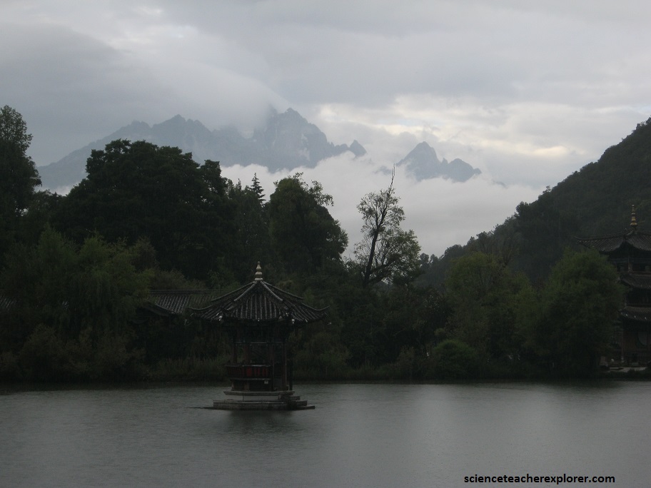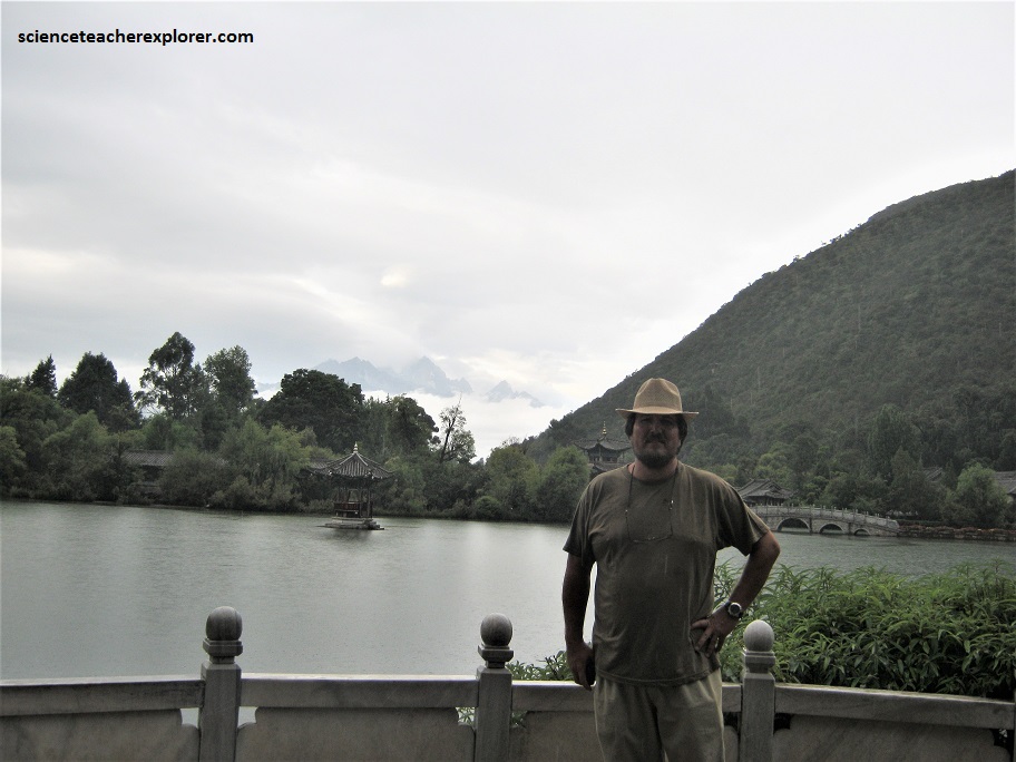 Pictured below, my trekkiing group took in the beautiful view of the Black Dragon Pool in the Jade Spring Park, Lijiang, Yunnan province, China. The Jade Dragon Snow Mountain is visible in background at left.
