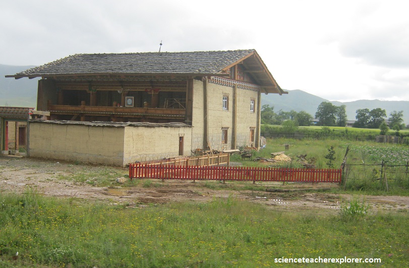 The people of Shangri-La, live in sturdy, two-story houses of timber and rammed earth on stone foundations, a balcony on the second floor, a small yard in front or to the side. People do domestic work here; like carpentry, chopping wood or skinning yak. Some hang hunting trophies or yak skulls from the second floor balcony rafters.