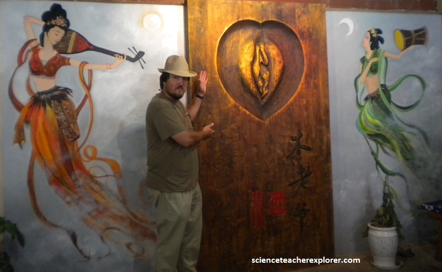 While exploring the extraordinary Mansion of Chief Mu, my trekking group came upon a small group of women, selling vagina wine. This intrigued us. Pictured above, was a wood-carved sculpture of a vagina. On the side of the bottle, was a art-depiction of this sculpture. It was like a religious symbol for this group of women. Our interpreter, Cui Lee, indicated that this was the symbol of the Mosuo Minority Group.