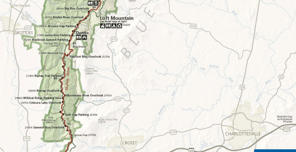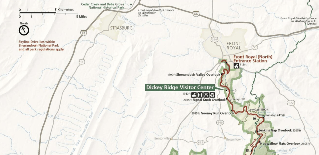 From the Shenandoah Valley Overlook, the next 12km southward, Skyline Drive continues its ascent along Dickey Ridge, (a long northward-extending spur of the main Blue Ridge).