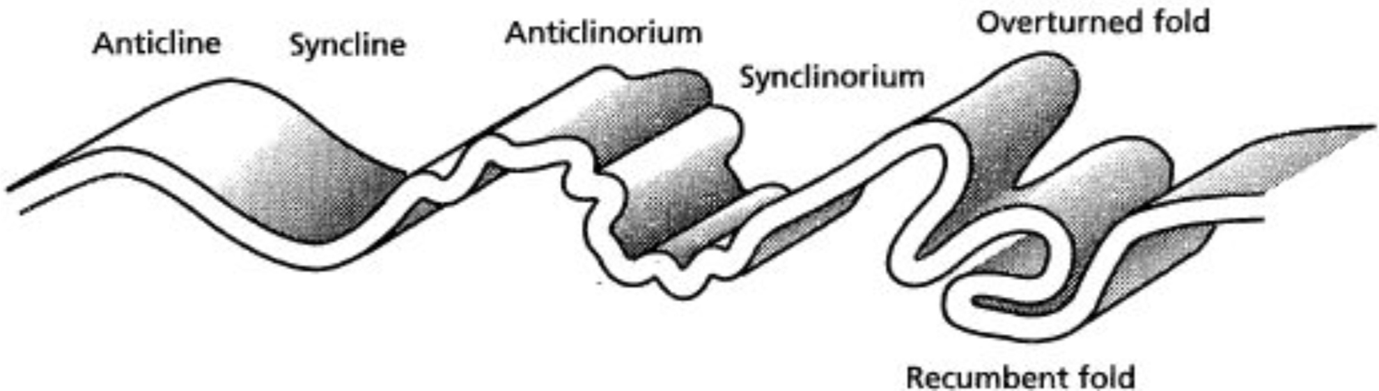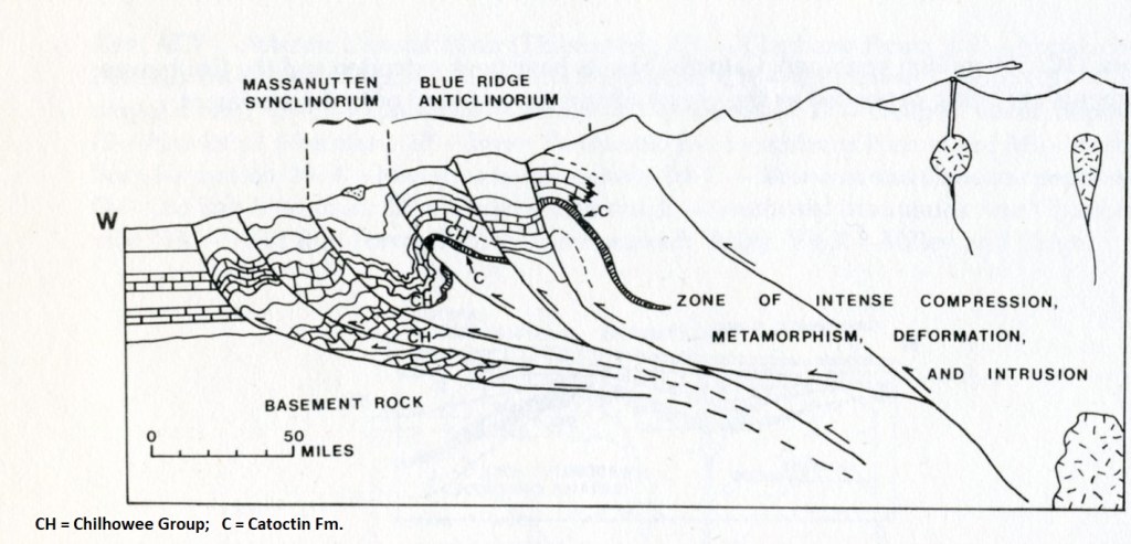 The mountains of Shenandoah are formed by resistant rocks located along the western side of a large, complex up-warped in the earth’s crust called the Blue Ridge Anticlinorium. This anticlinorium encompasses the entire Blue Ridge and Inner Piedmont area called the “Foothill Zone”. {Images below are from “Shenandoah National Park: An Interpretive Guide” Conners 1988). The two major fold of this area are the Blue Ridge Anticlinorium and the adjacent Massanutten Synclinorium, which has Massanutten Mountain occupying it’s central portion. The east limb of the Blue Ridge Anticlinorium dips very gently to the southeast and the west limb is nearly vertical, (imaged below). Note that both of these huge folds have numerous subsidiary folds associated with them.