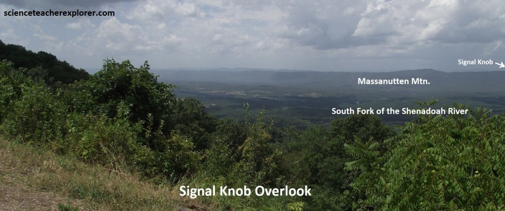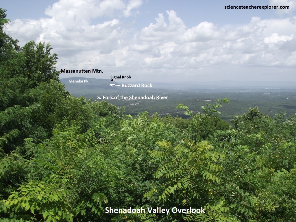 Pictured below at the Shenandoah Valley Overlook, Page Valley is the name for the valley of the South Fork of the Shenandoah River between the Blue Ridge and Massanutten Mountain. The high point near it’s northern end is Meneka Peak (about 800m elevation). This is often mistakenly identified as Signal Knob, an impressive promontory at the northwestern extremity of Massanutten Mountain 2km north of Meneka Peak.