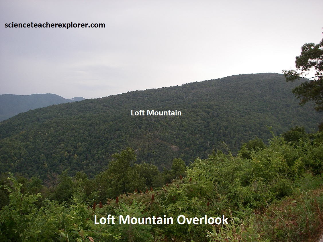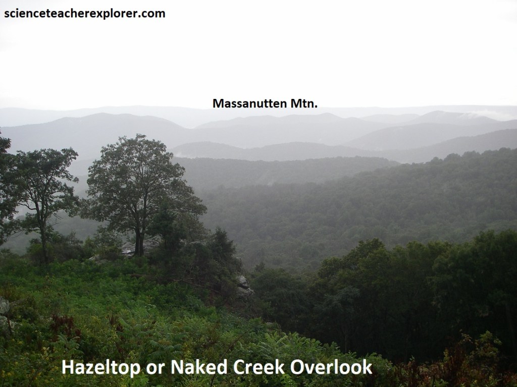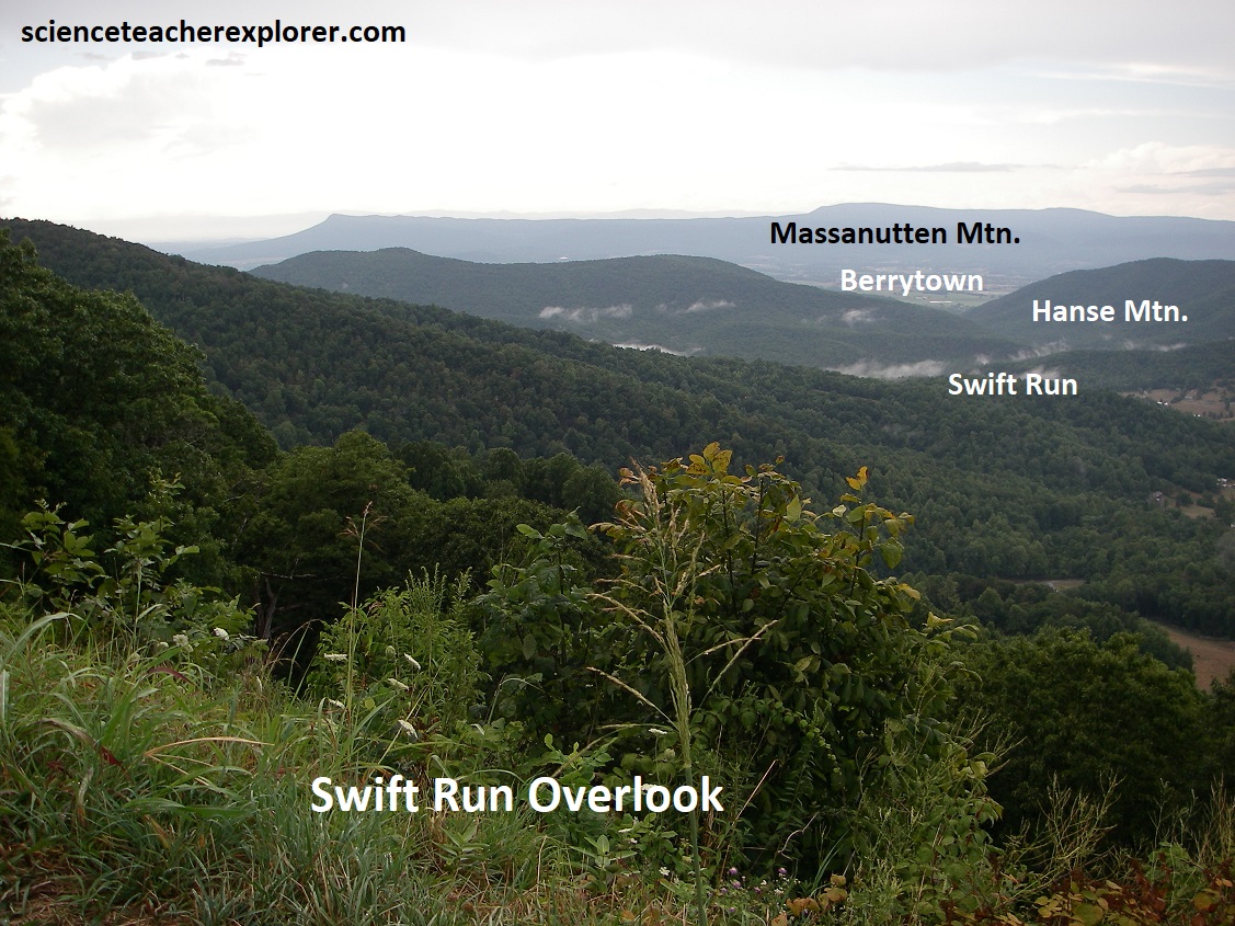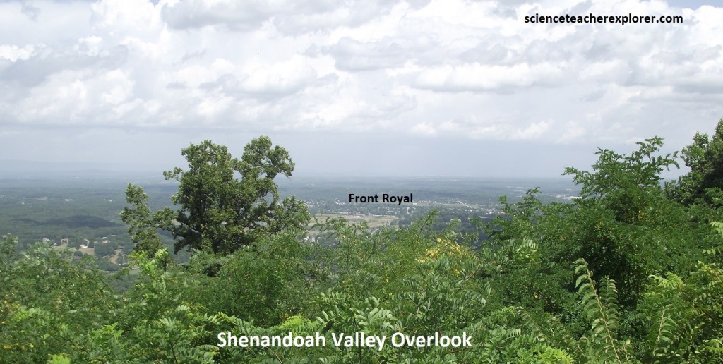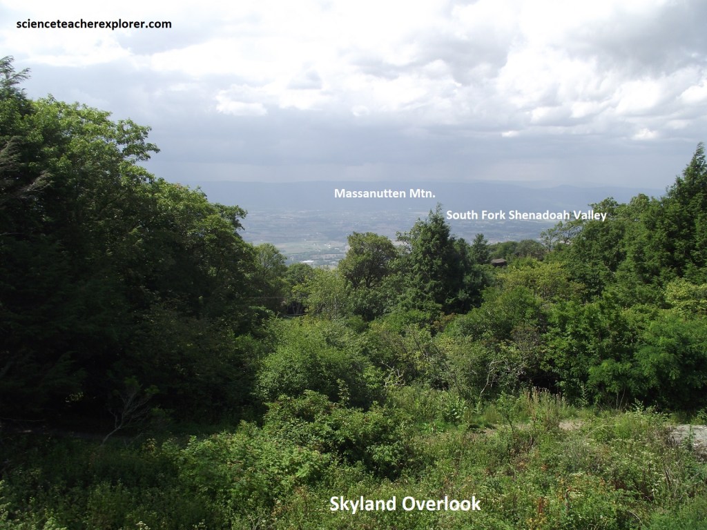 Our first overlook was the Shenandoah Valley Overlook, (pictured above and below). This is an impressive view of Front Royal. Bordering the South Fork of the Shenandoah, are several large industrial waste ponds of the huge Avtex Plant, (one of the world’s largest synthetic fiber facilities). Skyline Drive & the Shenandoah National Park occupies a 113km portion of the northeast trending Blue Ridge Mountains, a segment of the Appalachian Mountains. The Blue Ridge Mountains of northern Virginia are part of the Blue ridge Physiographic Province, (imaged below).