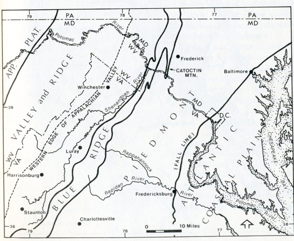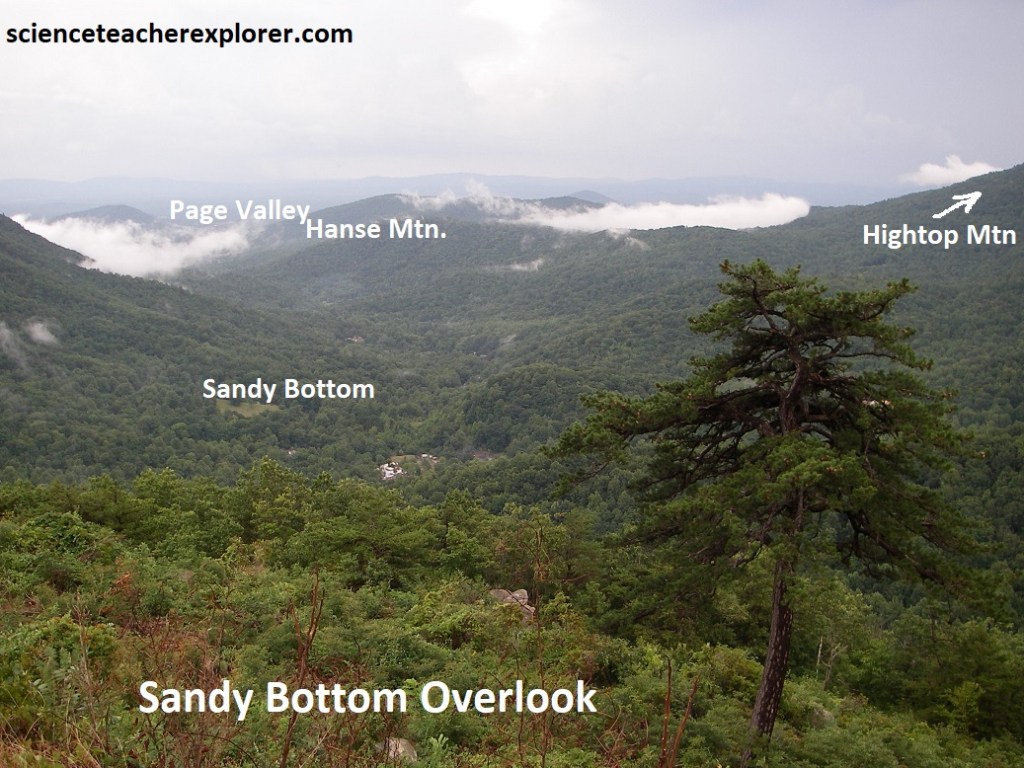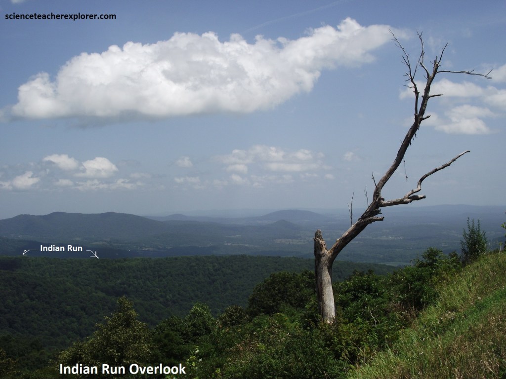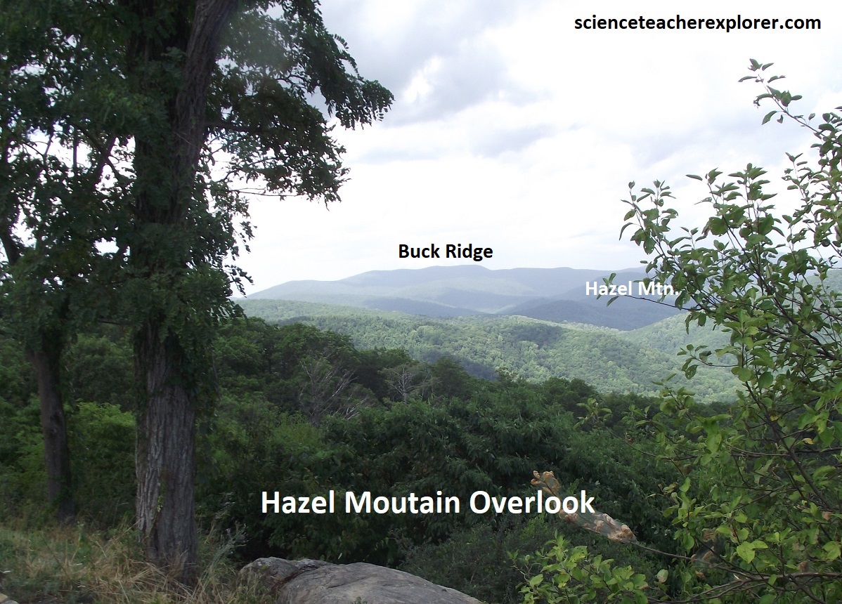 Our first overlook was the Shenandoah Valley Overlook, (pictured above and below). This is an impressive view of Front Royal. Bordering the South Fork of the Shenandoah, are several large industrial waste ponds of the huge Avtex Plant, (one of the world’s largest synthetic fiber facilities). Skyline Drive & the Shenandoah National Park occupies a 113km portion of the northeast trending Blue Ridge Mountains, a segment of the Appalachian Mountains. The Blue Ridge Mountains of northern Virginia are part of the Blue ridge Physiographic Province, (imaged below).