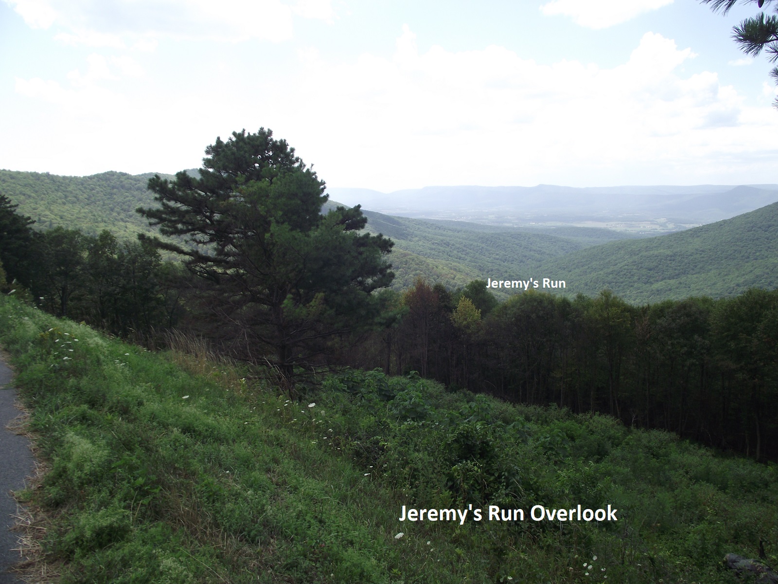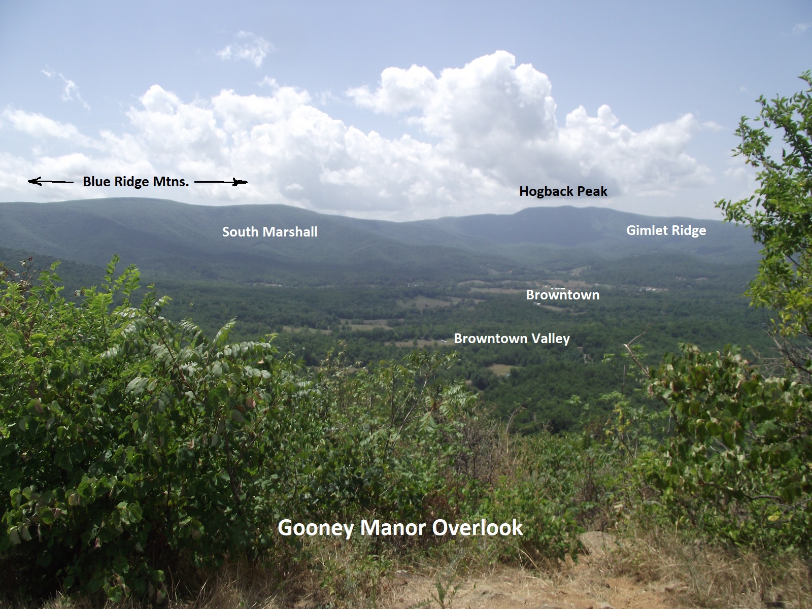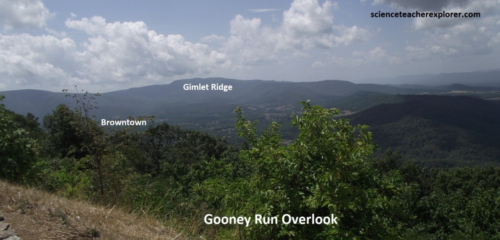 Another kilometer down the road, is the Gooney Manor Overlook. A panorama to the south shows Browntown valley, a broad expanse of privately owned land drained by north-flowing Gooney Creek and encircled by the Blue Ridge to the east and south and by Gimlet Ridge to the southwest. Browntown, a small village in the center of the valley, lies 3.7km, southwest of the overlook.