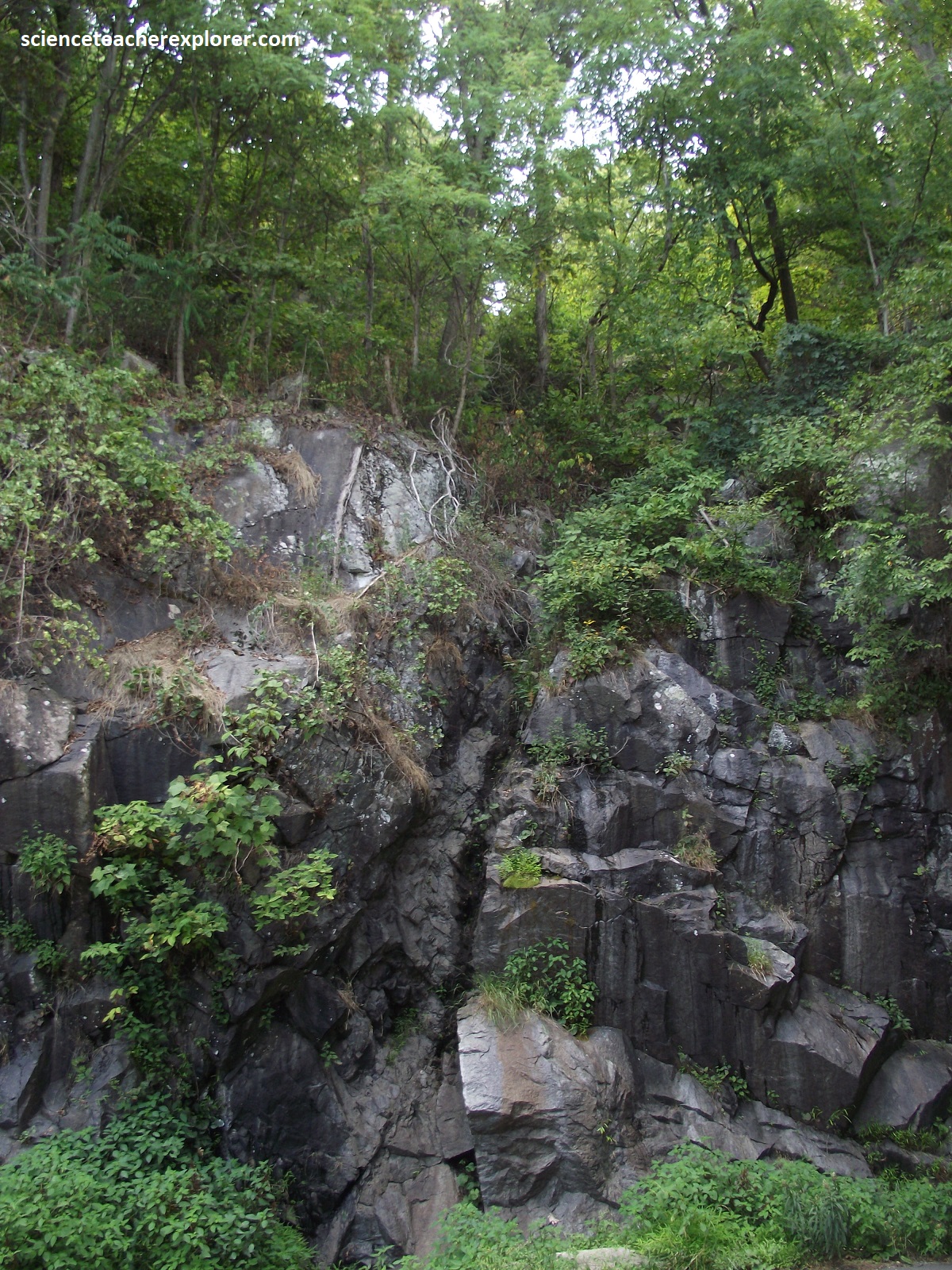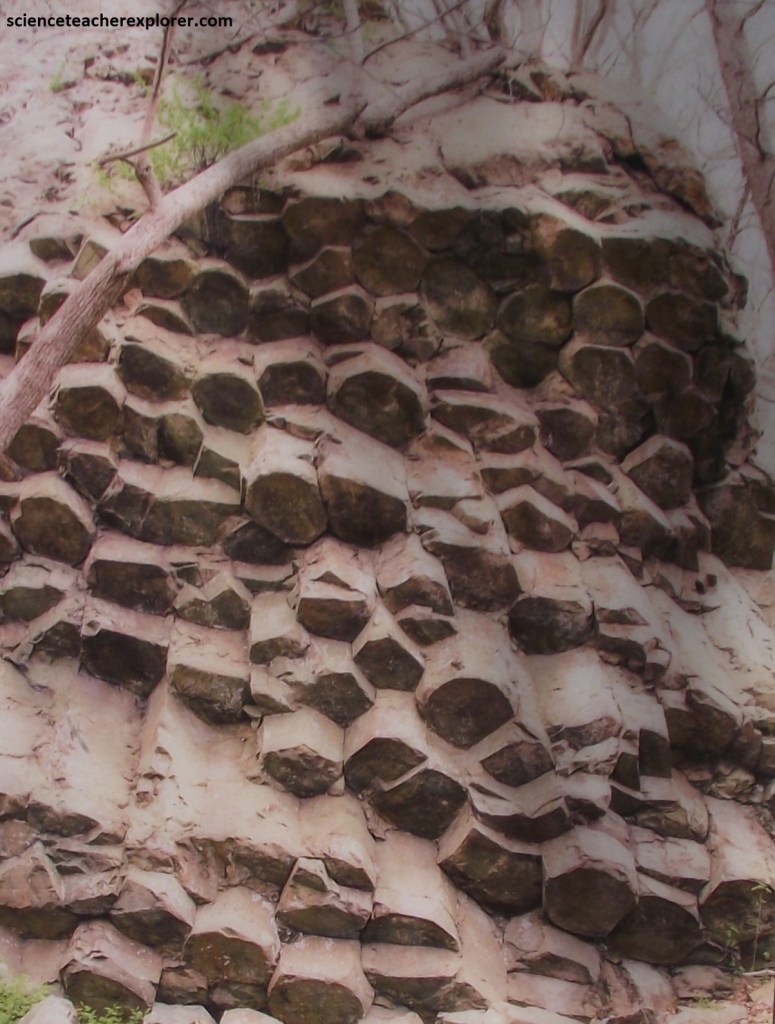 Once back in the car, we drove another 0.6km to the Indian Run Overlook, (pictured above). This provided our first view east into the 113km wide Piedmont Province, (foothills). Pictured below, the north end of the roadcut exposed some good columnar jointing in the Catoctin Formation.