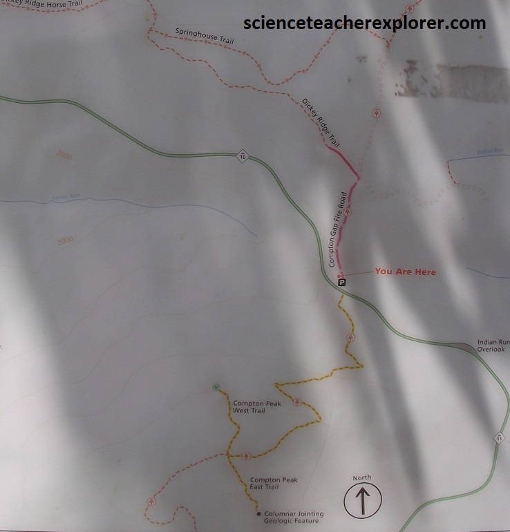 About 4km down the road, Becky and I parked at Compton Gap to trek some trails to Fort Windham Rocks (north) and Compton Peak (south). {Part of the Appalachian Trail}.