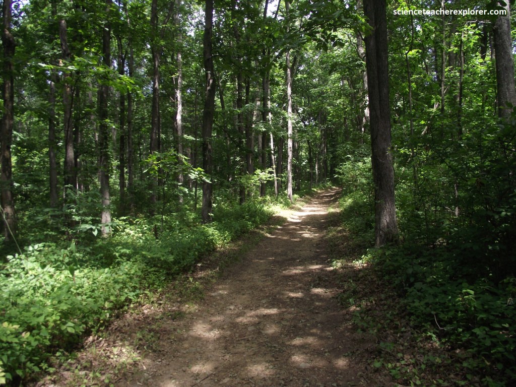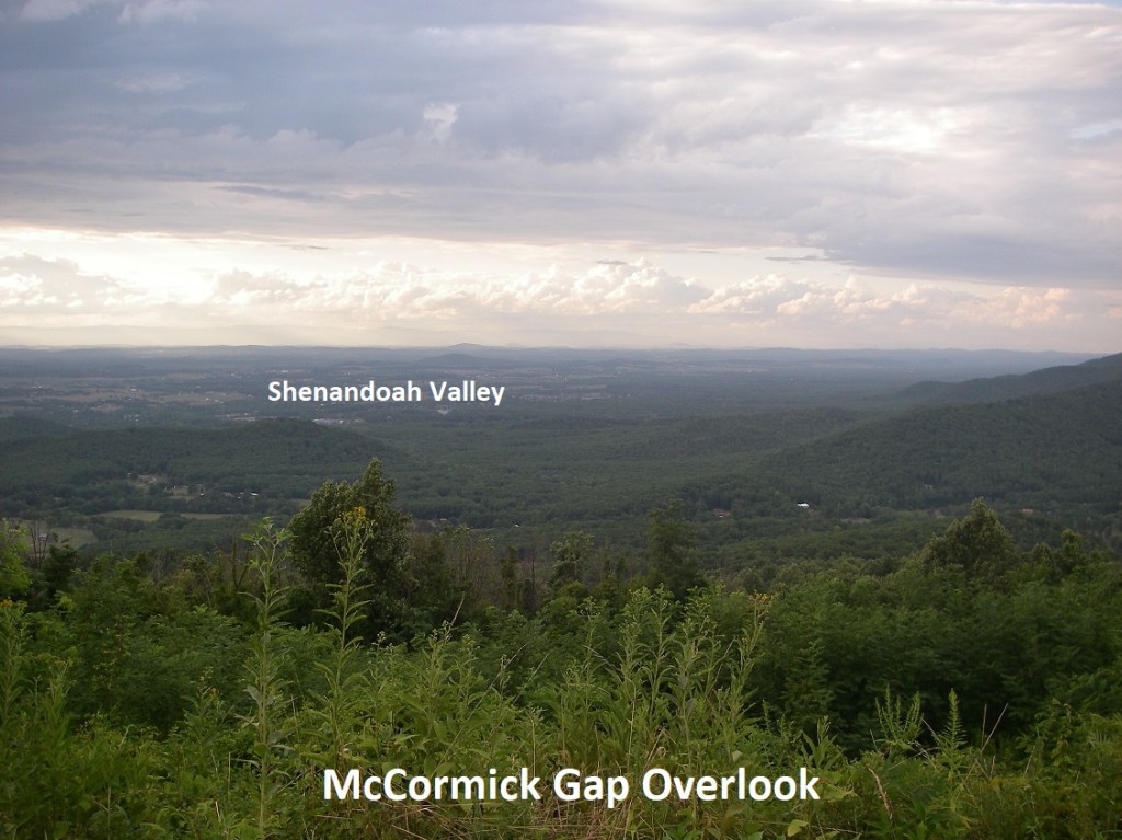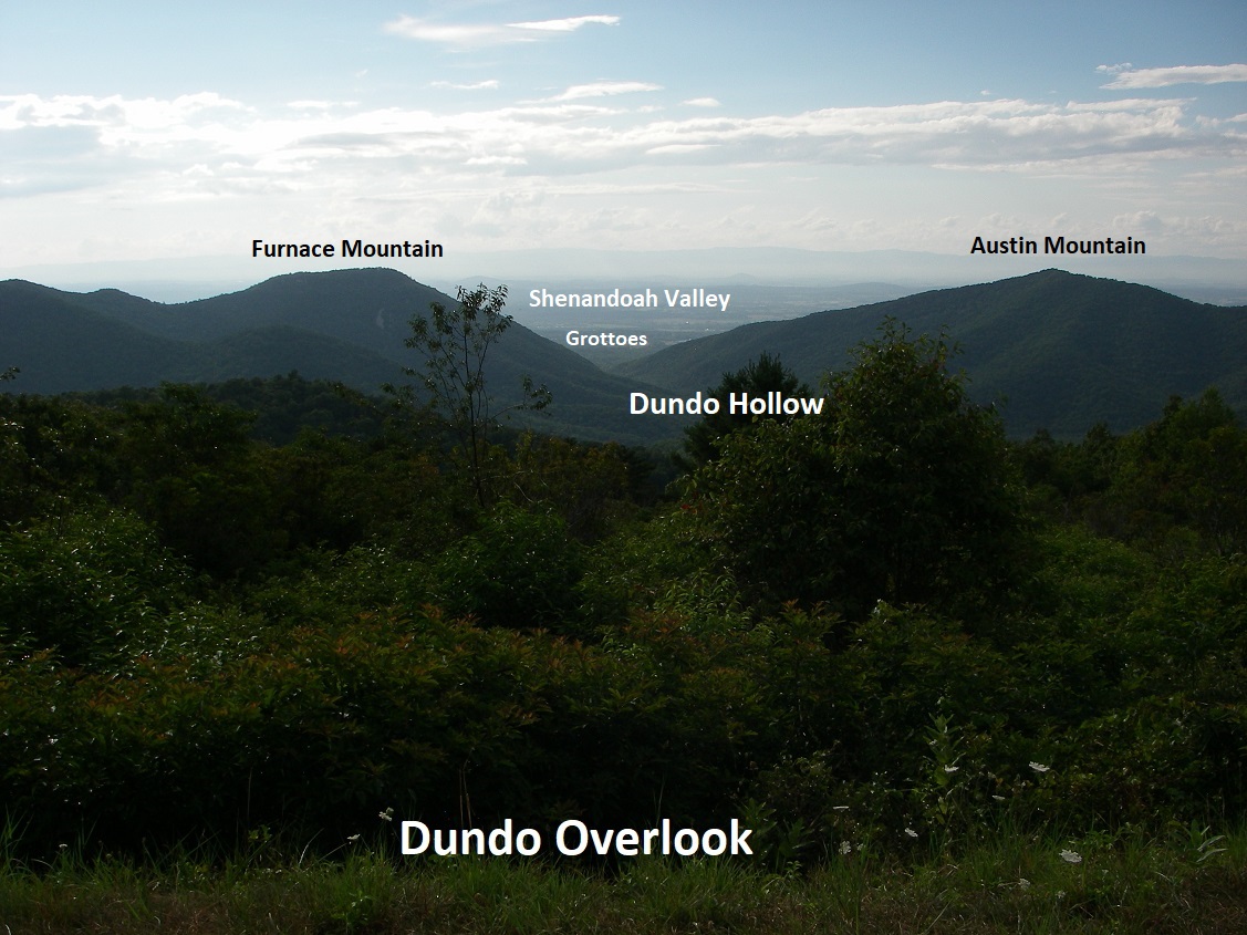 The next 2 km, we passed through Browns Gap. This gap is a famous turnpike over the Blue Ridge, connecting Shenandoah Valley to markets in the Richmond area, created in 1806. However, Stonewall Jackson marched his army through the gap in 1862 during the Civil War. Then in 1864, General Jubal Early and his troops established a position in the gap and defended it from Sheridan’s attacks for 2 days while awaiting reinforcements. The nearby Dundo Overlook views northwest down Dundo Hollow. Near the mouth of the hollow, Furnace Mountain rises to the left and Austin Mountain to the right. Both are capped by Erwin quartzites with southwest dipping ledges. Furnace Mountain was named for the Mount Vernon Furnace, built at its base in 1848 for the reduction of iron ore. Beyond the Dundo Hollow mouth is Shenandoah Valley sitting on limestones that are famous for its Caves. {e.g. Grand Caverns}.