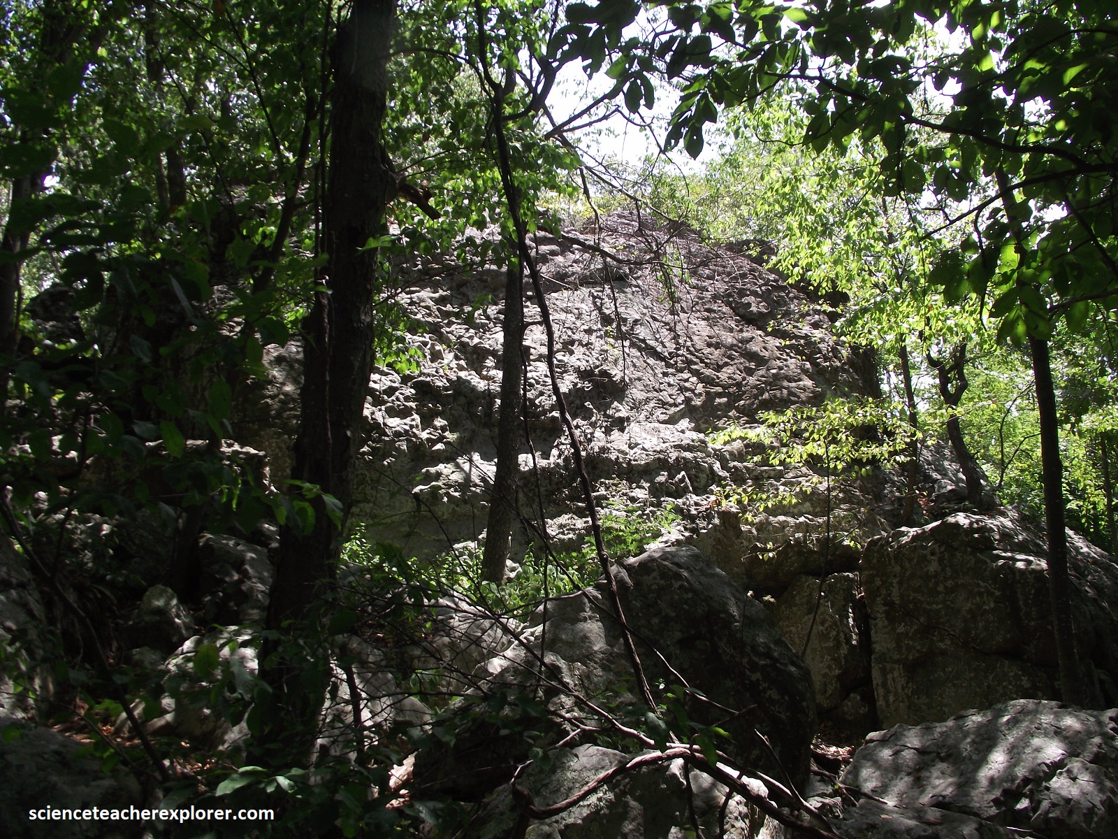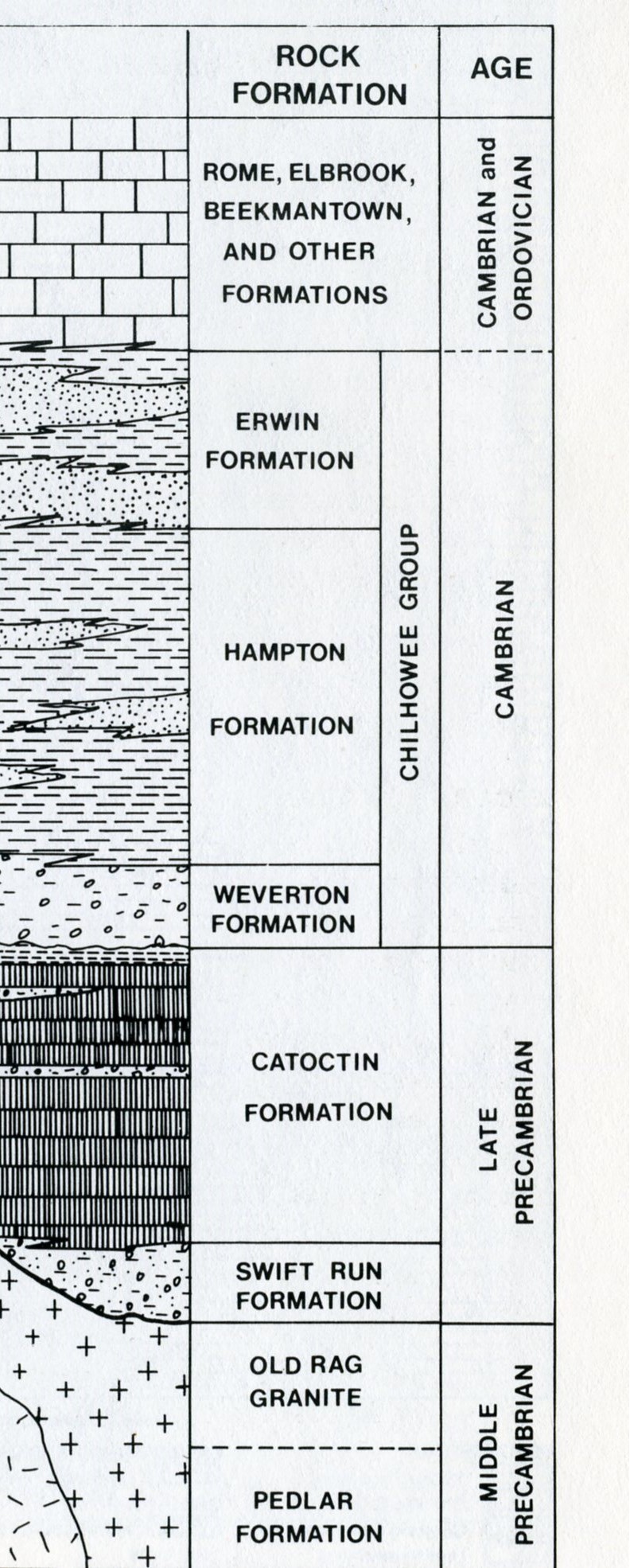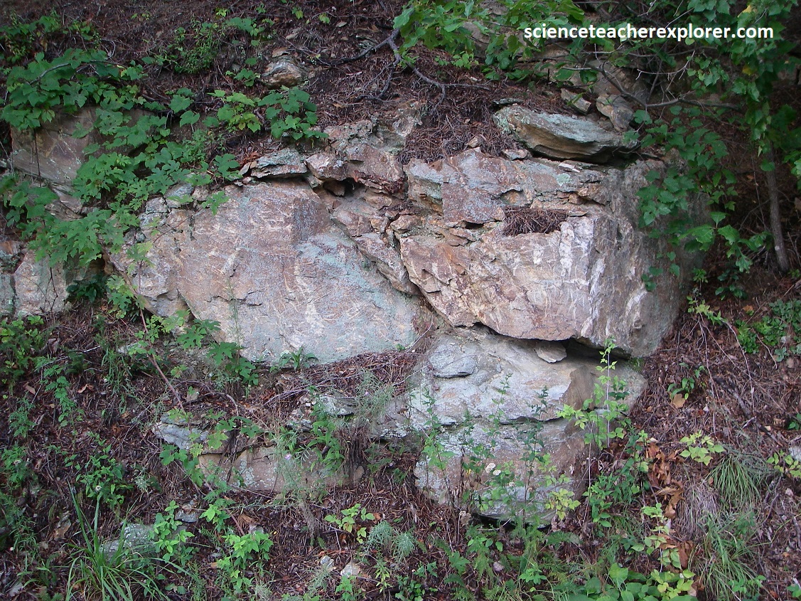 Passing a couple of gaps, (Smith Roach & Powell), and the Bacon Hollow Overlook, we came upon the Rocky Mount Overlook, (pictured below). Rocky Mount lies directly ahead. It is capped by the Erwin Formation whose quartzites form the scree and talus slopes seen along it’s slopes. A closer look at the hard, resistant quartzite, are seen about the overlook on the guard rocks and walls. {(Image of the stratigraphical column below is taken from “Shenandoah National Park: An Interpretive Guide” Conners 1988).