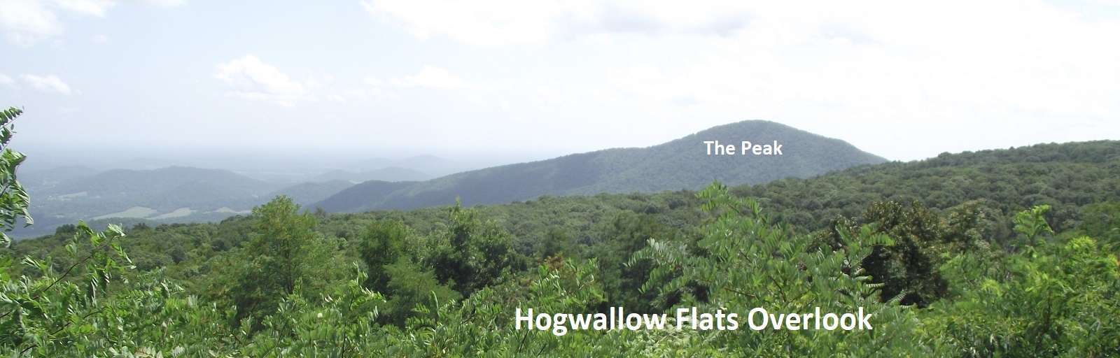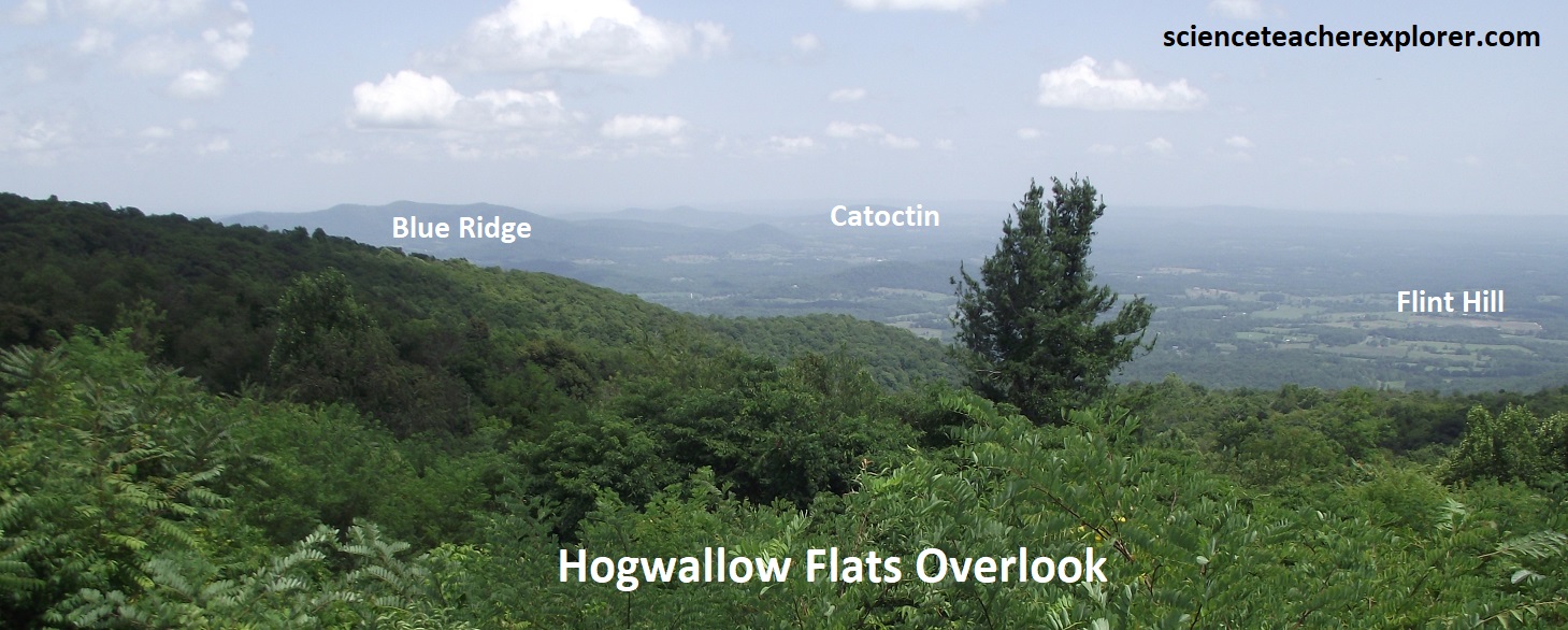 Pictured above, the Hogwallow Flats Overlook shows the Inner Piedmont terrain. Low ridges of Catoctin are visible 32km to the east at the far side of the Blue ridge Anticlinorium. The hills for the Inner Piedmont in the core of the huge crustal upwarp are supported by more massive plutonic and metamorphic rocks of the Pre-Cambrian basement. The Peak, composed entirely of the Pedlar Formation, is visible to the south. The small village to the southeast is Flint Hill, a very rural community of Rappahannock County, Virginia.