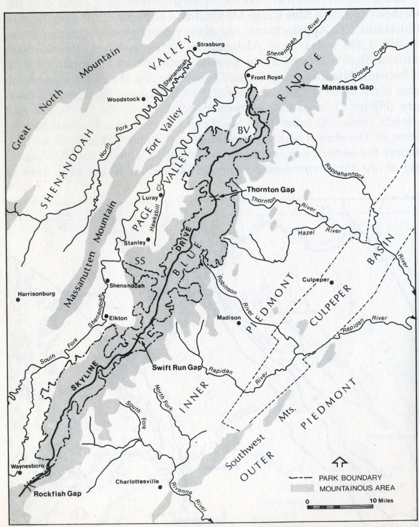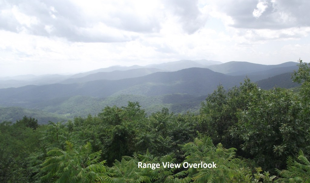 Pictured above, the Range View Overlook is one of the finest viewpoints in the Shenandoah N.P., including a rare panorama southward along the Blue Ridge. One can see and compare the Valley and Ridge terrain to the west with its large linear ridges and rich agricultural valley lands, with the Piedmont to the east, with its more random land use patterns, low hills and more widely scattered, less fertile farmlands.