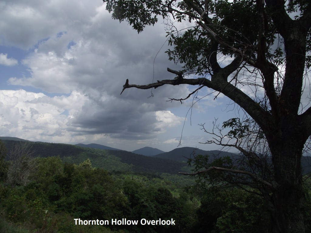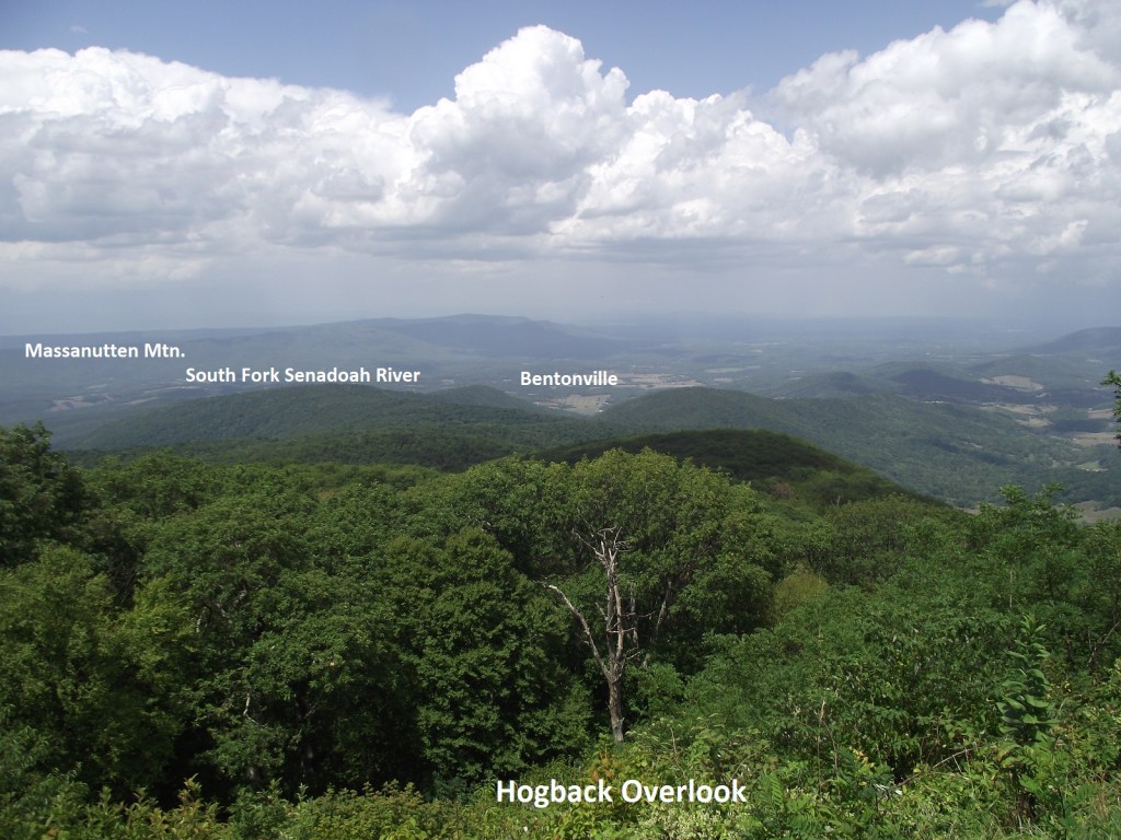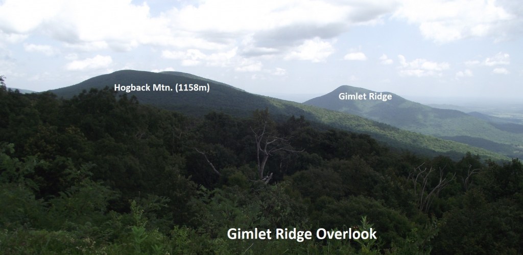 Pictured above, the Gimlet Ridge Overlook encompasses Hogback Mountain at the left (with the radio towers on top), and Browntown Valley with Dickey Ridge to its north and Gimlet Ridge to the south.