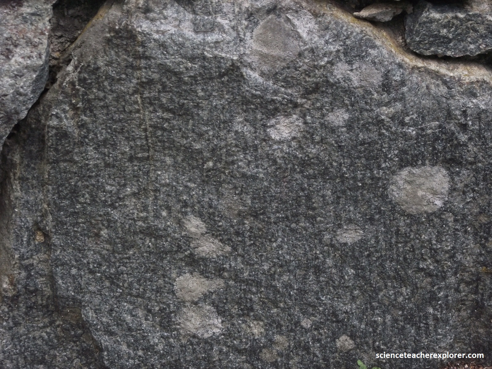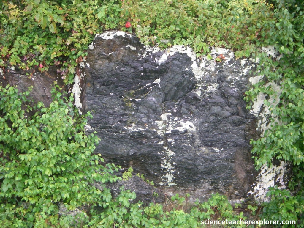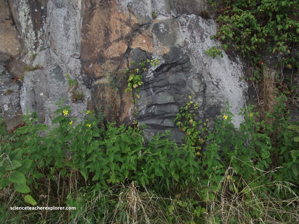 Pictured above, the coarse-grained and gneissic textures of the 1.1 billion year old Pedlar, along with the types of minerals present, indicate that this formation was formed at high temperatures and pressures will below the earth’s surface. In addition to gneiss, the Pedlar contains massive non-foliated granitic rocks, suggesting that the temperatures to which it was subjected may have been hot enough to approach the melting point, thus explaining it’s igneous rock-like texture.