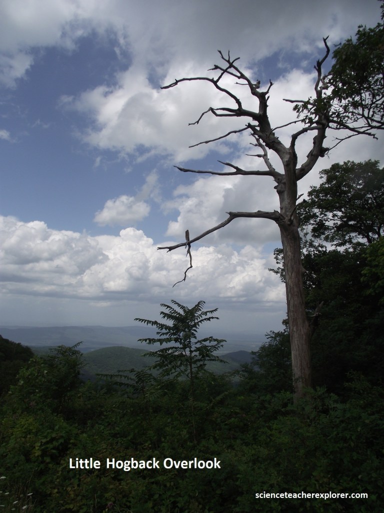 After leaving Big Meadows, Becky and I continue driving south on Skyline Drive for another 3.5km to Naked Creek Overlook. Pictured above, we get a view across Long Ridge at the mountains beyond. This broad panorama west shows many peaks and ridges west of the Blue Ridge. According to the geological map, Long Ridge is capped with the Weverton Formation, (a conglomerate from the Cambrian Chilhowee Group).