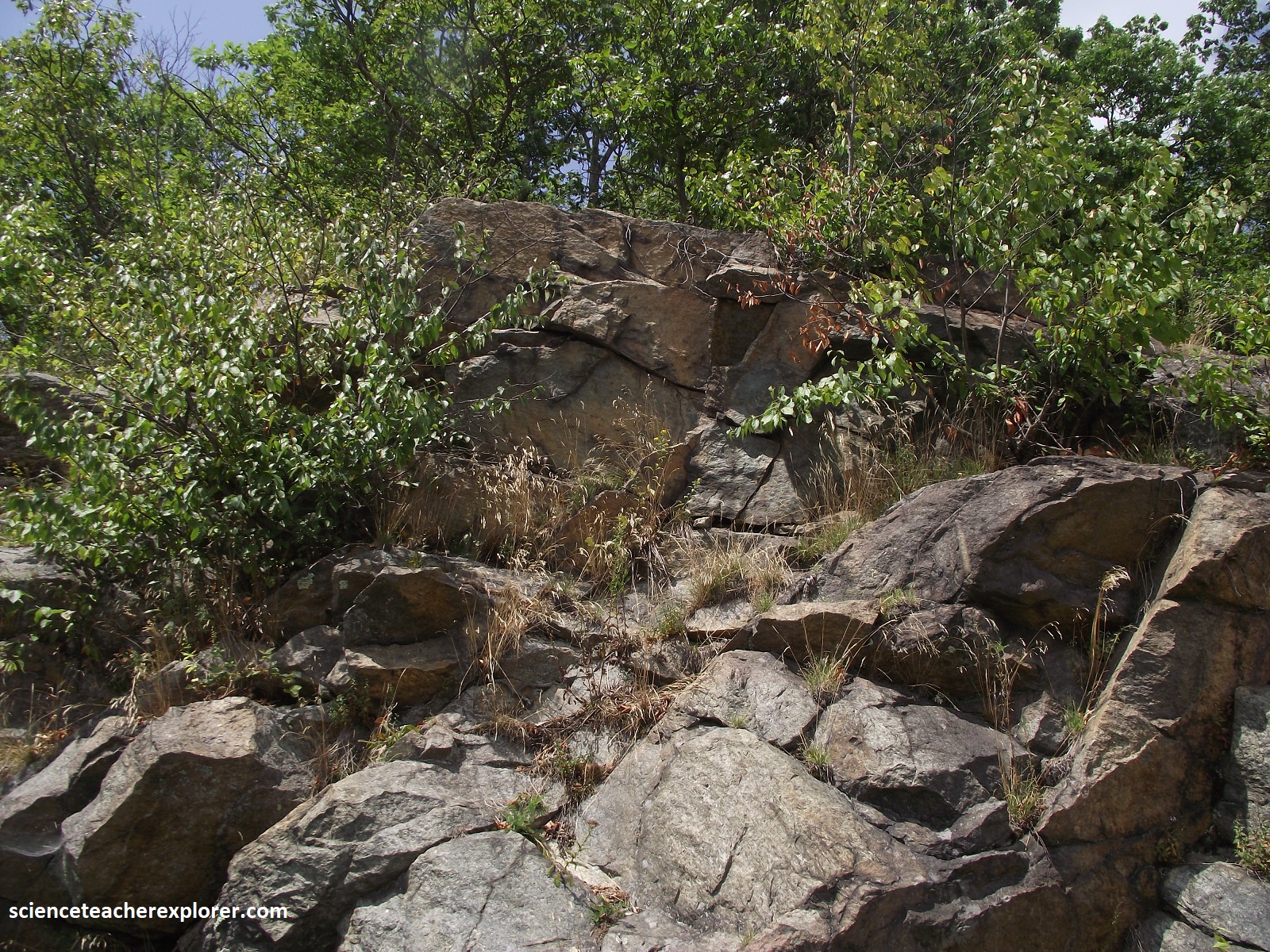 Pictured above, the Little Hogback Overlook shows a mountainside that drops into Browntown Valley that descends 667m in 2.2km. This is the site of the unconformable contact, (representing a time interval of 500 million years), between the Catoctin and Pedlar Formations. We’ll be viewing Pedlar rocks, for the next 2.6km on our way along the Skyline Drive.