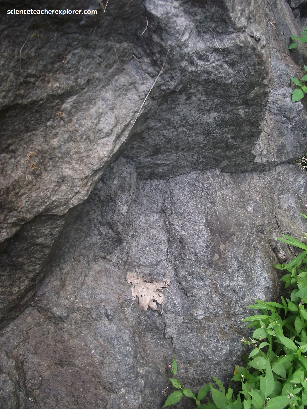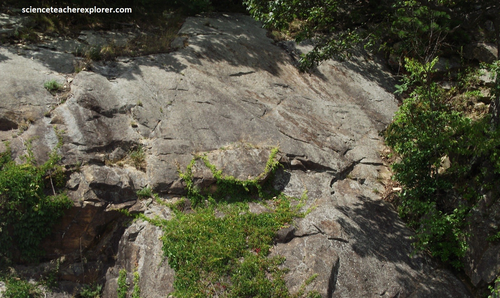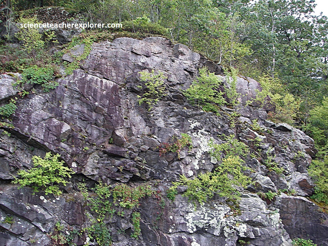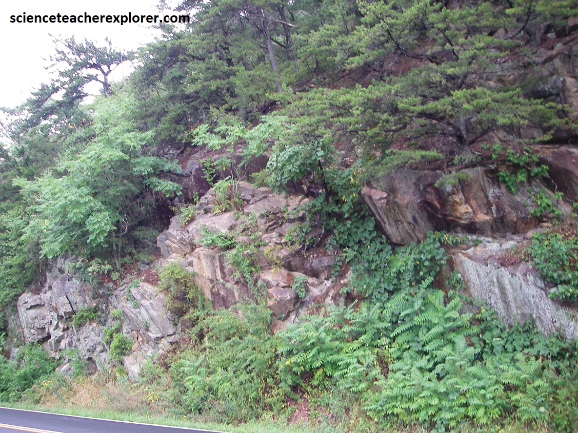 Becky and I continued driving south along the Skyline Drive, when we crossed the US33 junction at the Swift Run Gap. US33 runs west to east from Harrisonburg through Elkton to Stanardsville. Driving up from the canyon bottom floor (2.7km) to the south, gave us a better view of the gap from the Swift Run Overlook, (pictured above). The gap itself is underlain by the granitic rock of the 1.1 billion year-old Pedlar Formation. Roadcuts along the way exposes the jointed Pedlar granodiorite containing epidote, (pictured below).
