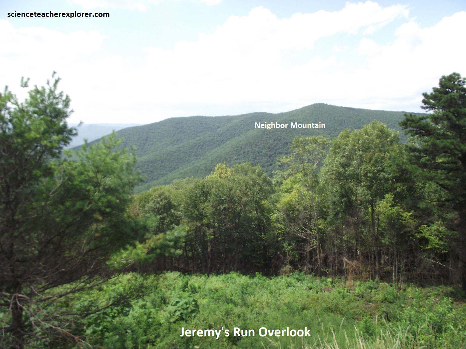 Pictured above, a magnificent overview of Jeremy’s Run. The upstream part of the canyon to the north is centered over a gentle anticlinal flexure, and the parallel ridges on each side (the Blue Ridge crest and Knob Mountain across the canyon) follow synclines. These folds occur along the gentle southeastern limb of the larger anticlinorium mentioned above. Chilhowee strata cap both ridges and the Catoctin composes most of the Jeremy Run Canyon. As seen above, beyond Jeremy’s Run V-shaped canyon are parts of Page Valley and Massanutten Mountain. At the left is Neighbor Mountain.