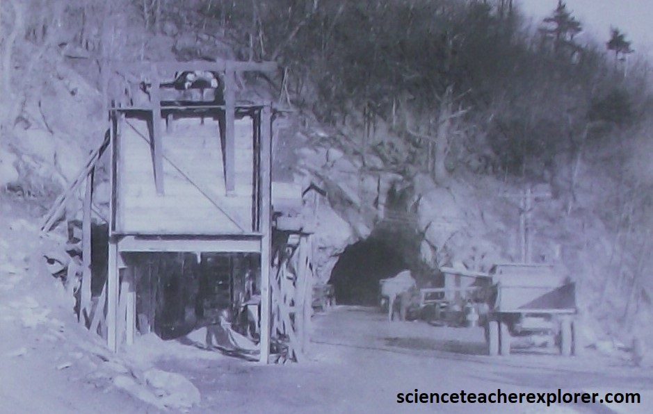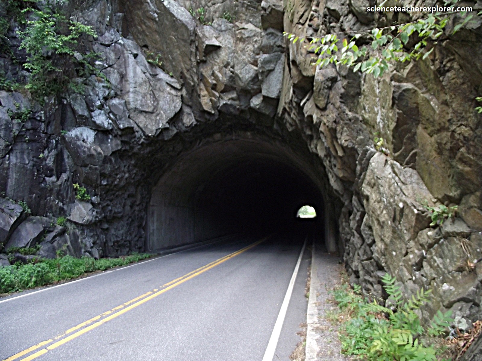 Becky and I continued driving south along Skyline Drive, where we passed a junction with US211 at Thornton Gap. US211 was one of the earliest roads to cross the Blue Ridge as early as 1746. The gap is a consequence of accelerated weathering and erosion along rocks weakened by movements along the Stanley Fault during the Alleghenian Orogeny at the close of the Paleozoic era. At Thornton Gap, the fault crosses from the east side of the Blue Ridge to the west side and separates older up-thrusted Pedlar granitics to the south from the Catoctin greenstones to the north. In about 1.1km we came across Marys Rock Tunnel. {Note the historical image below is taken from an interpretive sign on-site}.