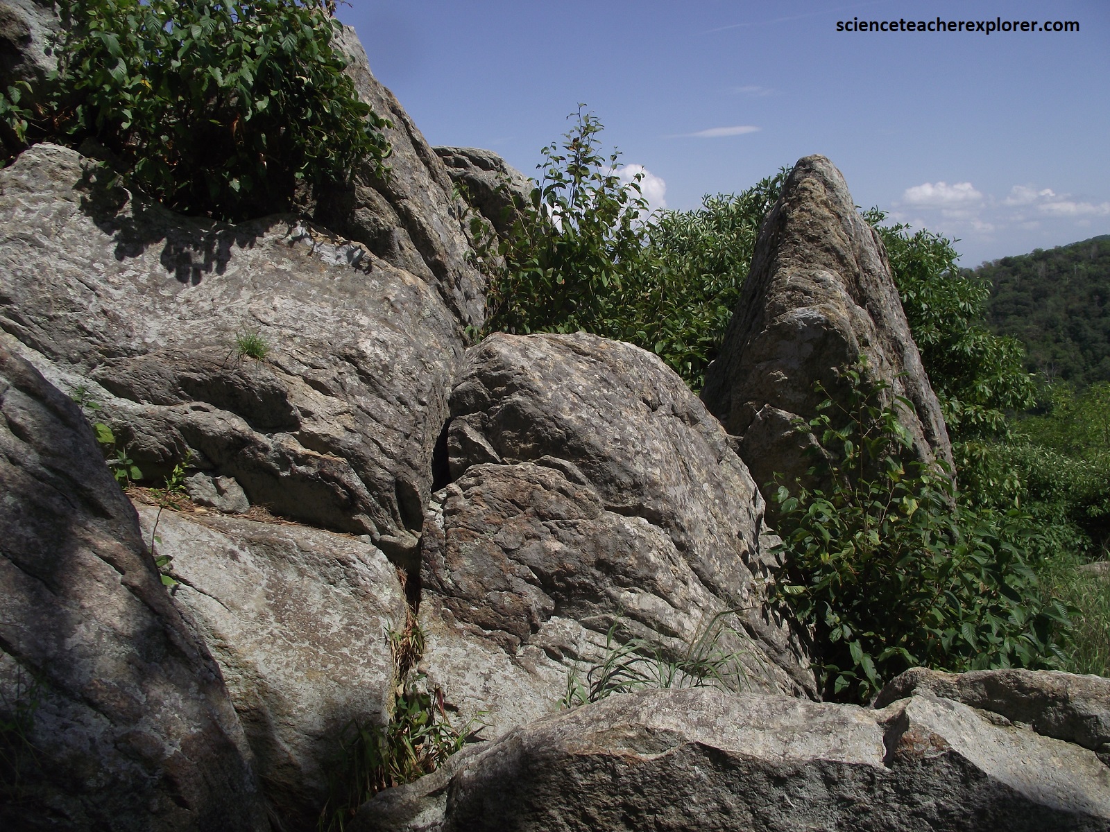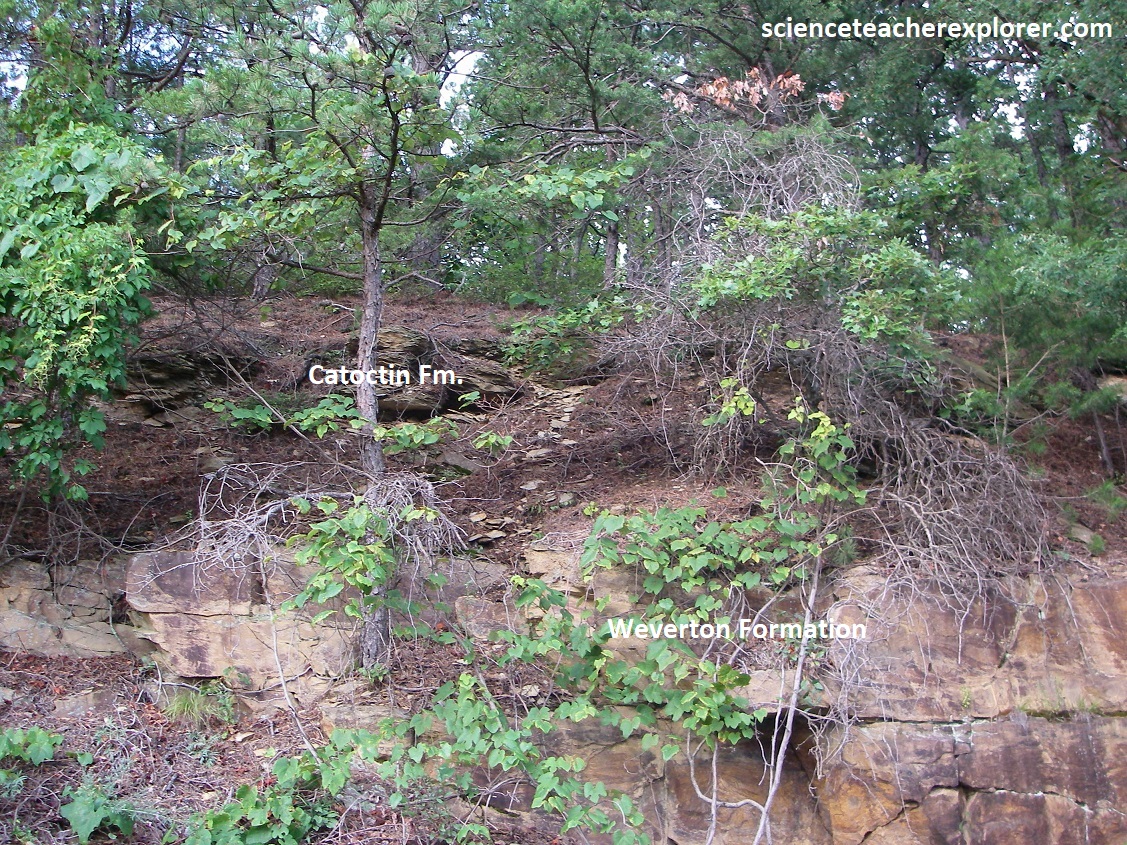 Pictured above, the Gooney Manor Overlook and the upper parts of the higher mountains, (except the Hogback Pk.), are supported by the Catoctin Formation, (600 million years old). The remainder of the nearby terrain seen from here is underlain by the granitic Pedlar formation (1.1 billion years old).