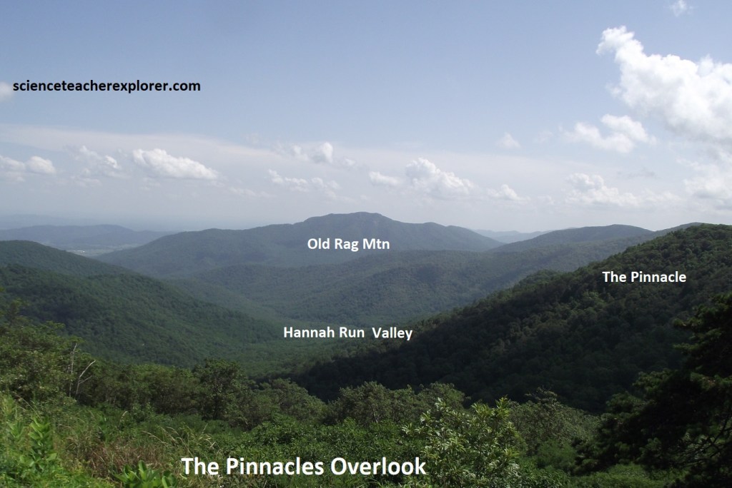Pictured above, Pinnacles Overlook views down Hannah Run valley at Old Rag Mountain (1090m elev.), 4.8km to the south. Pinnacle Ridge lies along the right side of Hannah Run and the summit of The Pinnacle (1243m elev.) is about 0.8km northwest of the overlook.