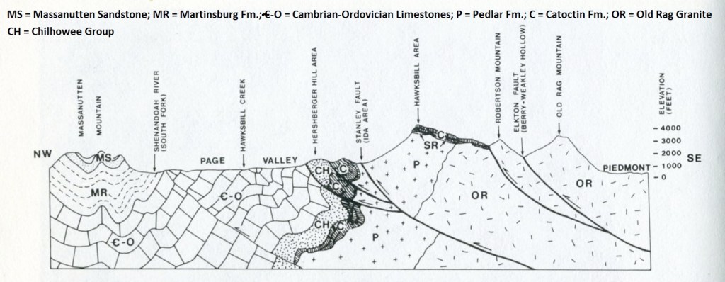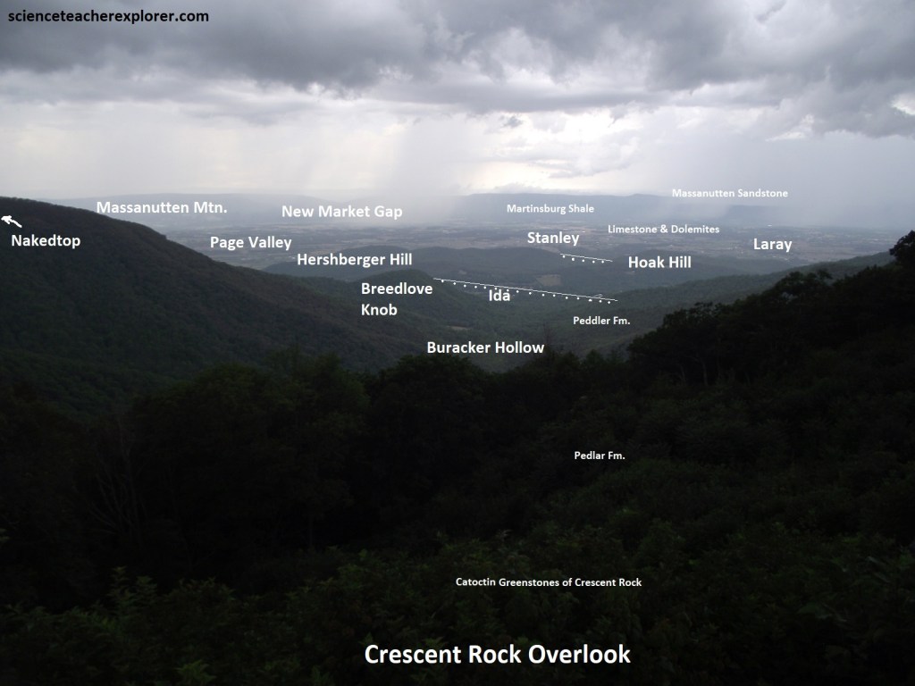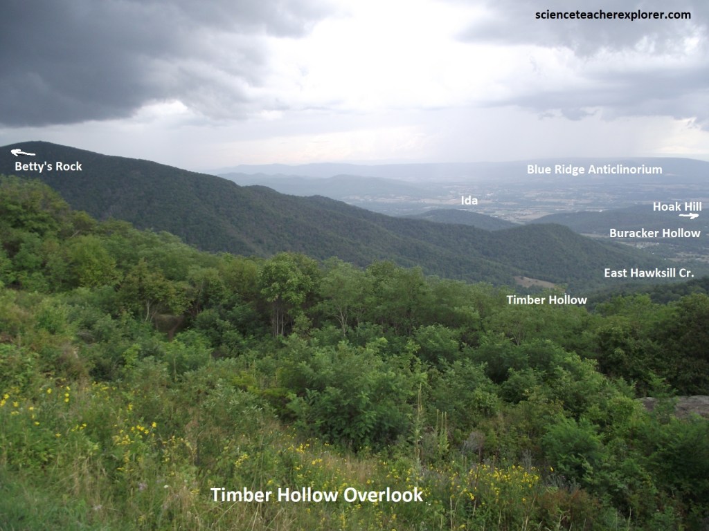 Pictured above, Timber Hollow Overlook gave us a view over the hollow of East Hawksbill Creek, the upper part of which is called Timber Hollow; the lower part, Buracker Hollow. At the mouth of the hollows, resting on alluvium deposited by East Hawksbill Creek, is the small hamlet if Ida. Ida sits in a northeast-trending valley eroded along the trace of the Stanley Fault. Pedlar granitics underlie underlie the terrain between the overlook and the fault. West of the fault are low hills composed of tightly folded and faulted Chilhowee and Catoctin rocks lying along the overturned northwestern limb of the Blue Ridge Anticlinorium.