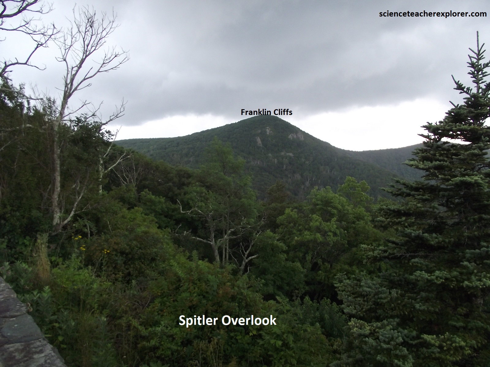Pictured above, the Crescent Rock Overlook views northwest along Baracker Hollow with the imposing north side of Hawkesbill Mountain, (1350m elev.) looming above to the left. The geology of this area is pictured above. In the rainstorm, we continued onto the Spitler Knoll Overlook where I got a great view of the Franklin Cliffs, (pictured below).