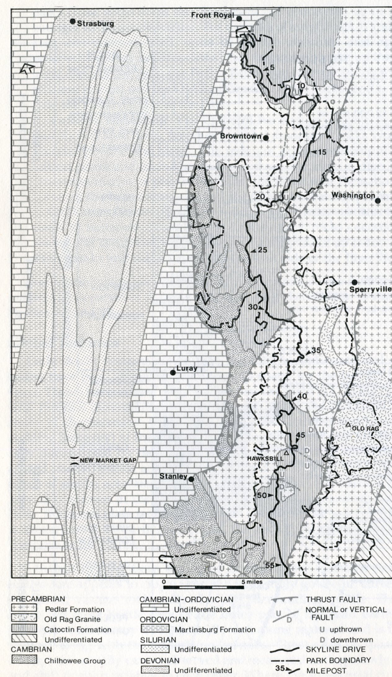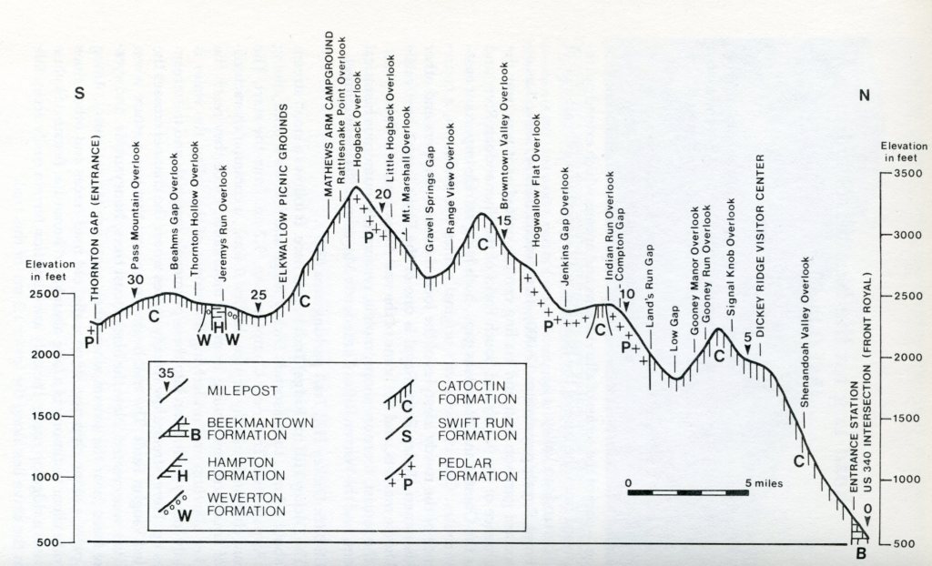 Becky and I continue 4.8km to the Elkwallow Wayside for snacks at the store. On the way down from Hogback Mountain to the Wayside, we crossed back into the Catoctin rocks and a fault zone. The terrain around the Elkwallow Wayside Picnic area, seems to have flattened out. Much of this is due to the erosive nature of the contrasting structure and rock types that are separated here by a section of a normal faulting and the Stanley Thrust Fault seen in the geological maps of Shenandoah National Park, (north half is on the left and the south half is on the right. [Note that Elkwallow Wayside is just south of Browntown on the left]. (Images below were taken from “Shenandoah National Park: An Interpretive Guide” Conners 1988).