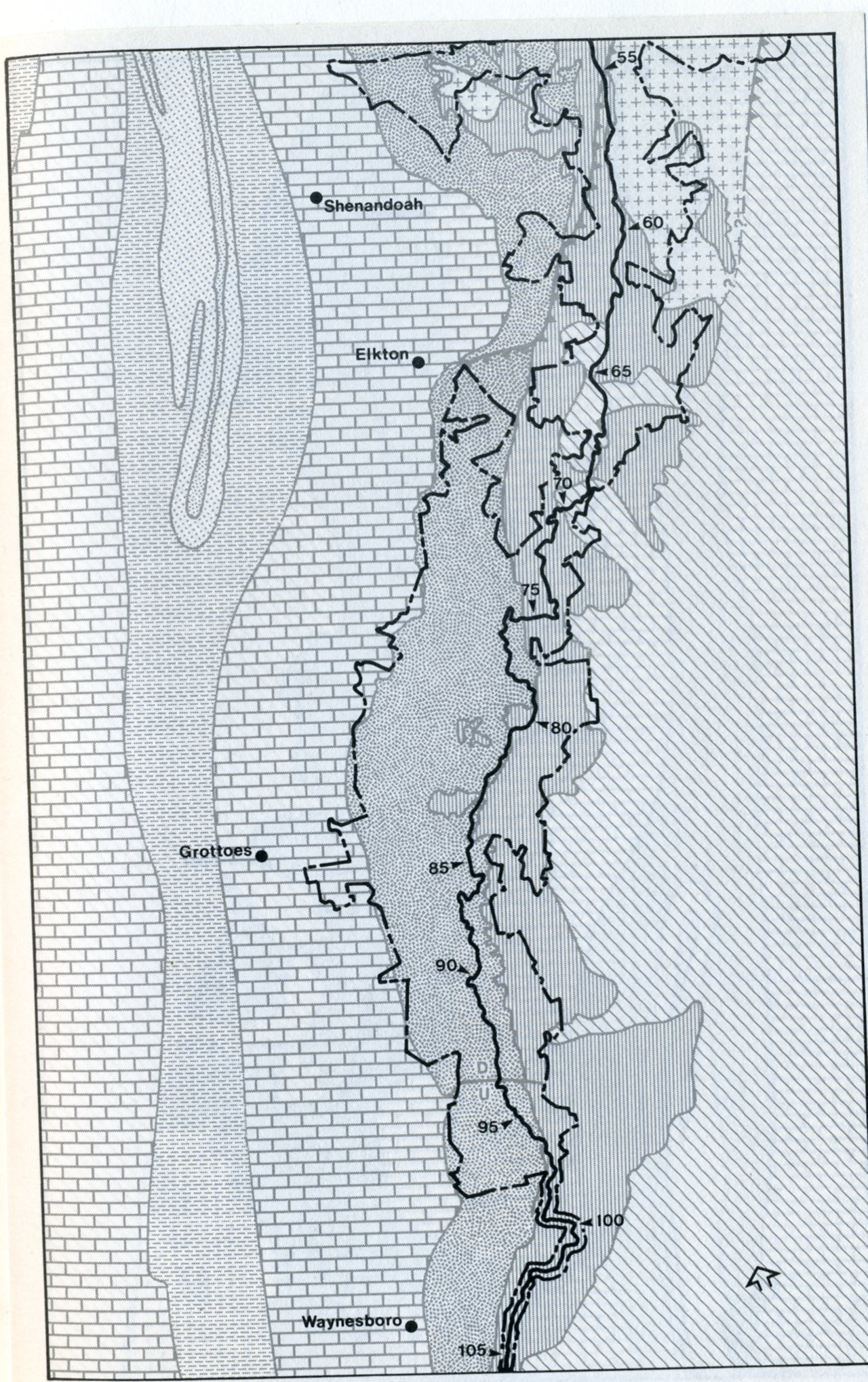 Pictured above, Signal Knob Overlook provides an excellent view westward across Page Valley to the double ridges of the northern end of Massanutten Mountain. The meanders of the South Fork of the Shenandoah seen here are entrenched 50-67m below the level of the rolling floor of Page Valley. The width of the meander belt ranges from under 2km to about 5km, and the river has a gradient of about 1m/km. Here, it is noticed that the South Fork migrates away from the Blue Ridge toward the base of Massanutten Mountain. The rolling terrain immediately below, between the base of the Blue Ridge and the Shenandoah River, consists of very old alluvial fans which have been eroded into low ridges extending out towards the river.