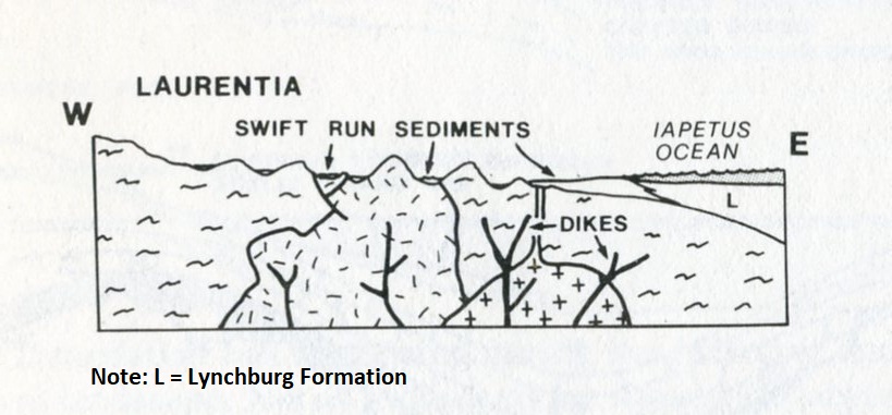 Imaged above, at 620 million years ago, the Grenville Mountains eroded down. The Iapetus Ocean had opened up to the east due to the separation of Laurentia from Gondwanaland with a rift. The Swift Run formation was deposited in the Shenandoah area with the Lynchburg Formation to the east. Additionally, igneous dikes intruded from below.