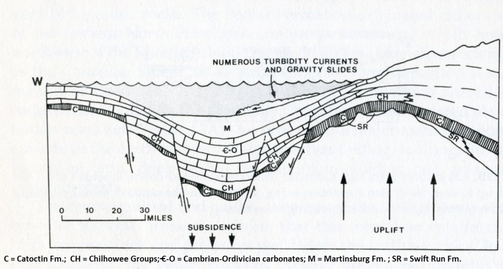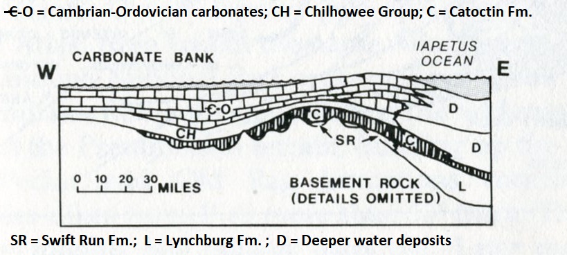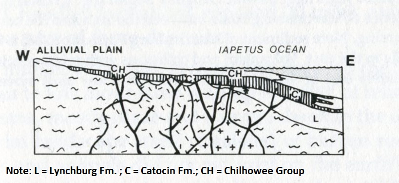 Imaged above, at 560 million years ago (during the Cambrian), Catoctin basalts had been extruded during the late Pre-Cambrian and the Chilhowee sediments were being deposited during the Cambrian as the ocean advanced westward onto the continent.