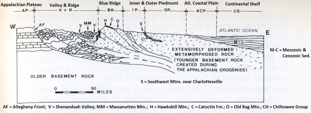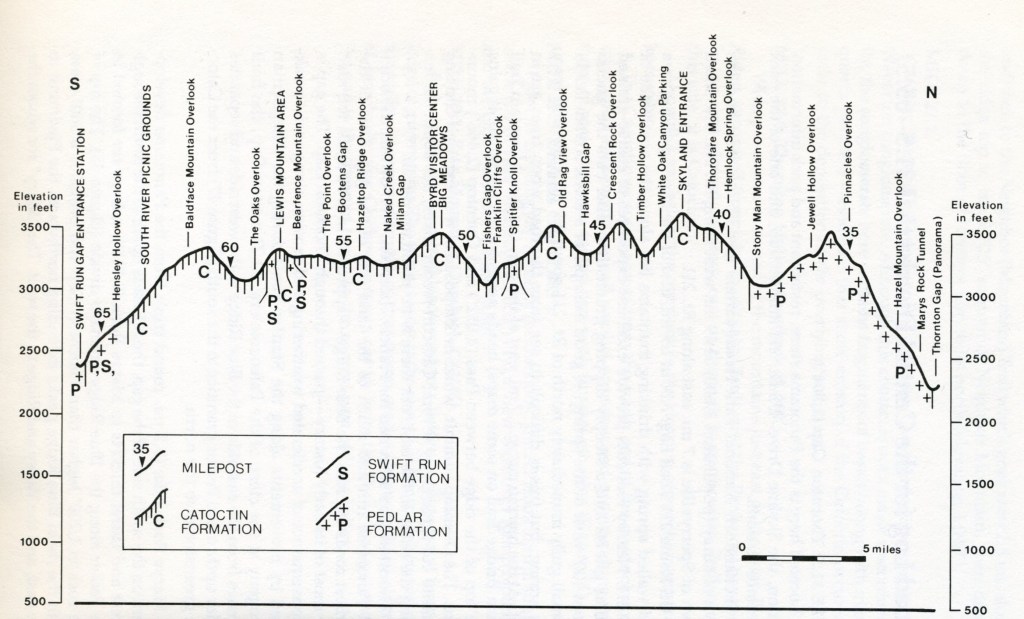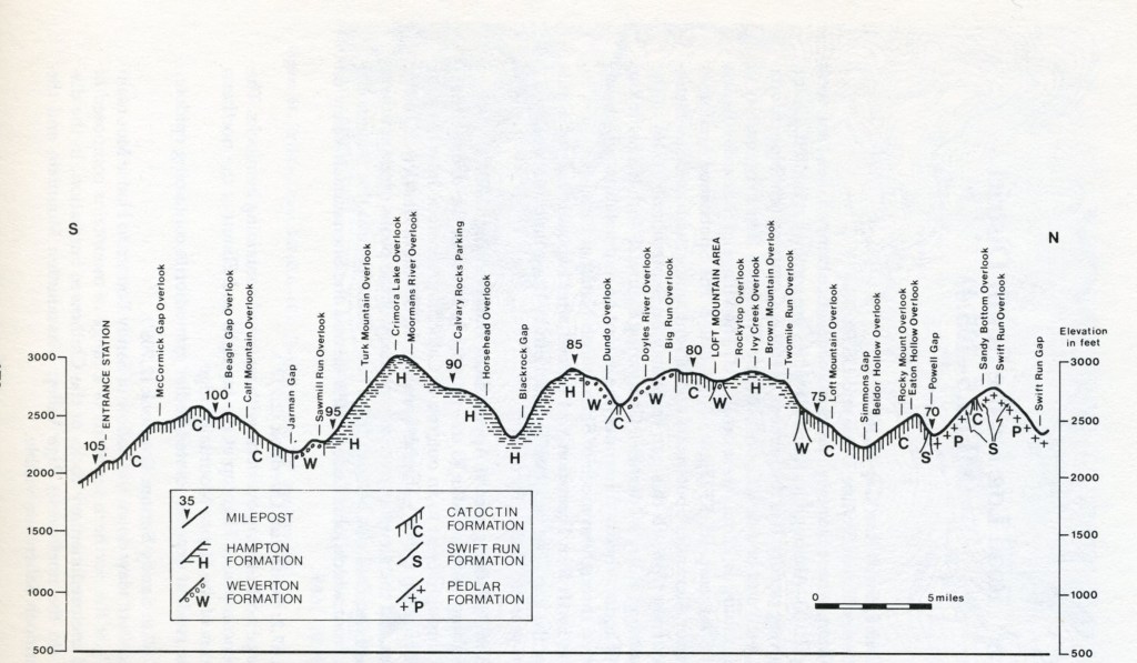 The sequence of geological formations composing the local terrain is representative of outcrop patterns along the side of an eroded upfold along the northwestern limb of the huge Blue Ridge Anticlinorium. Imaged above, the formations get progressively older eastward toward the central part of the anticlinal structure. We’ll also see the same progression from older to younger as we progress from here & drive south on Skyline Drive.