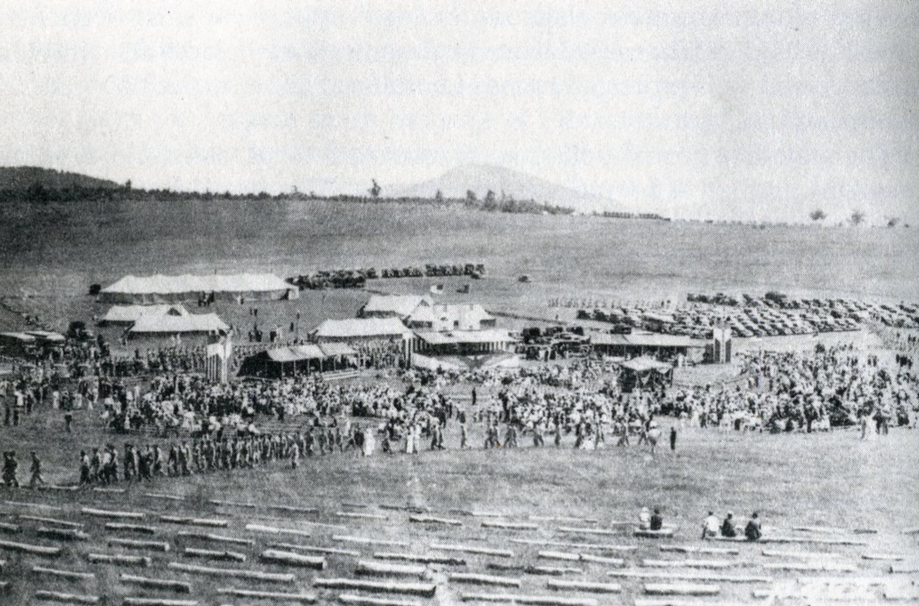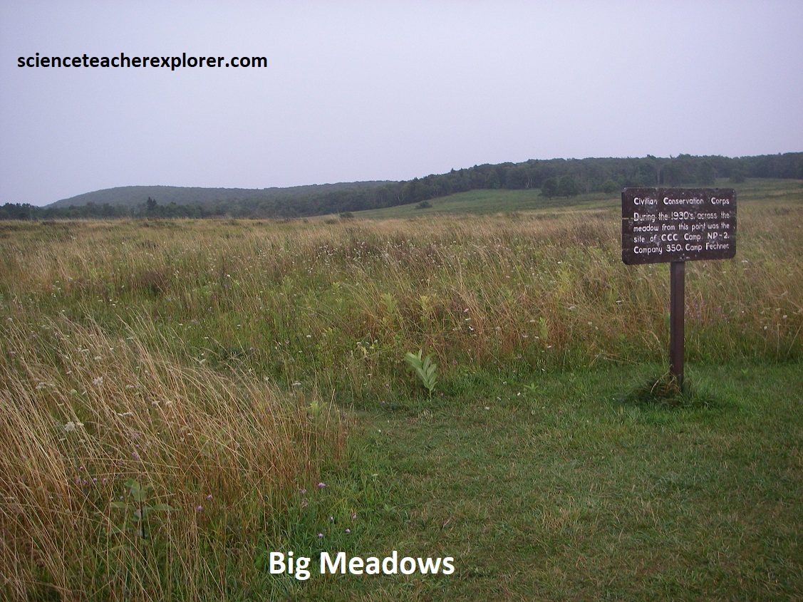 Pictured above, Big Meadows is the only large treeless area in the Shenandoah National Park, and lies at about 1167m elevation atop a plateau-like upland approximately 2.6km2 area. Big Meadows is underlain by some 600m of gently dipping Catoctin lava flows and contains 2 shallow marshes that are both drained by the Hogcamp Branch. Poorly drained soils and the relatively cold, harsh environment may have discouraged tree growth, allowing sedges and grasses to maintain small meadows here in the natural state. The historical photo seen above is the gala dedication of Shenandoah National Park, (which featured President Franklin D. Roosevelt in 1936), was held here at Big Meadows. Big Meadows supports over 270 species of vascular plants.