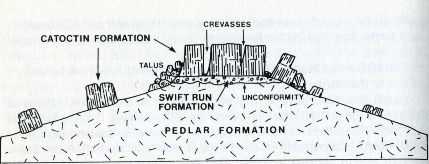 The surrounding rocks in the area, (for this part of the Skyline Drive), are from the Catoctin Formation. The 560 million year old, (late Pre-Cambrian), Catoctin Formation consists of metamorphosed lava flows (greenstone) and associated rocks (volcanic breccia, phyllite and slate). These resistant greenstones support the loftiest peaks and high plateau-like areas in the Shenandoah National Park.