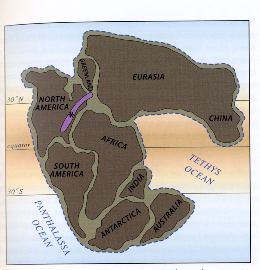 Imaged above, at 250 million years ago, was the Alleghenian Orogeny. The image above shows the western part of the young Appalachian Mountain chain on the Pangean supercontinent. Africa had joined North America east of the area shown.