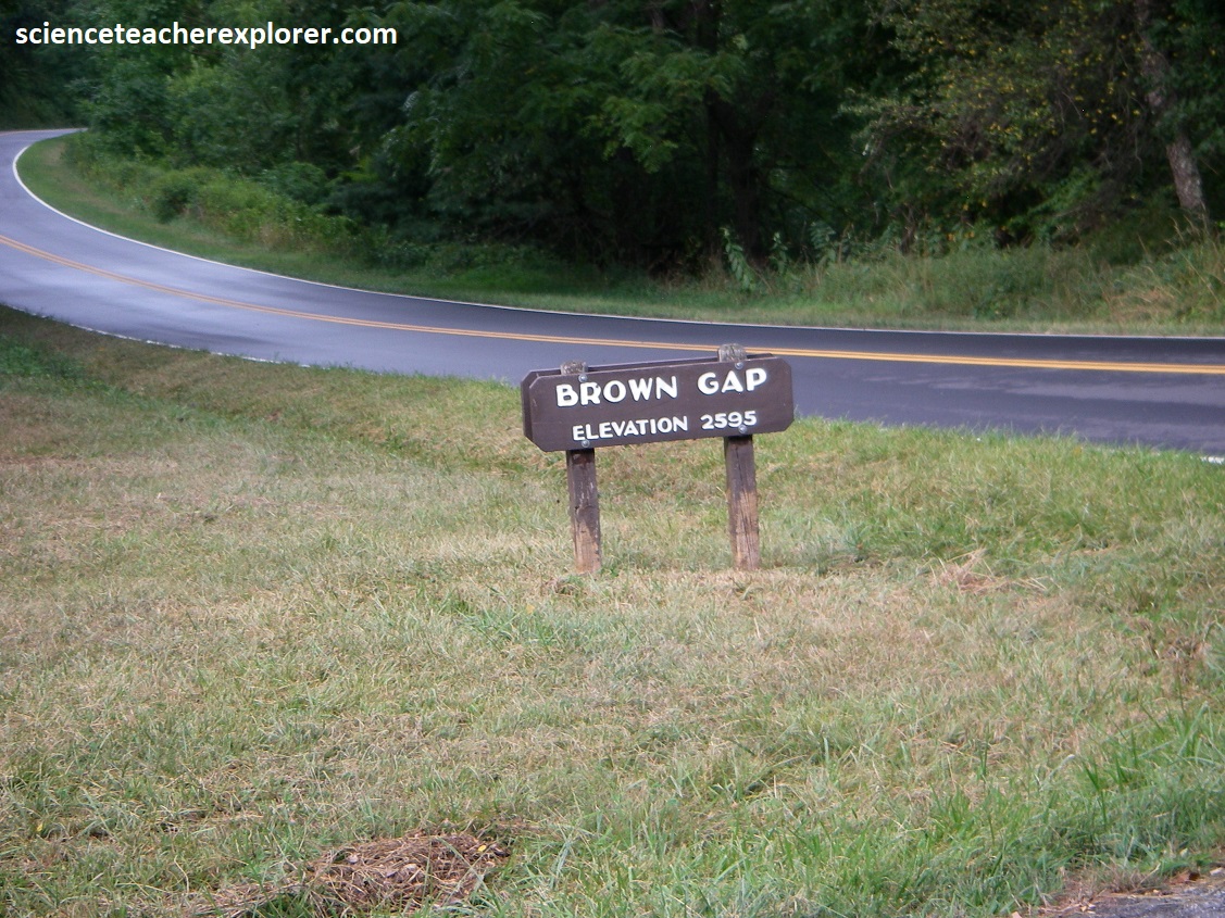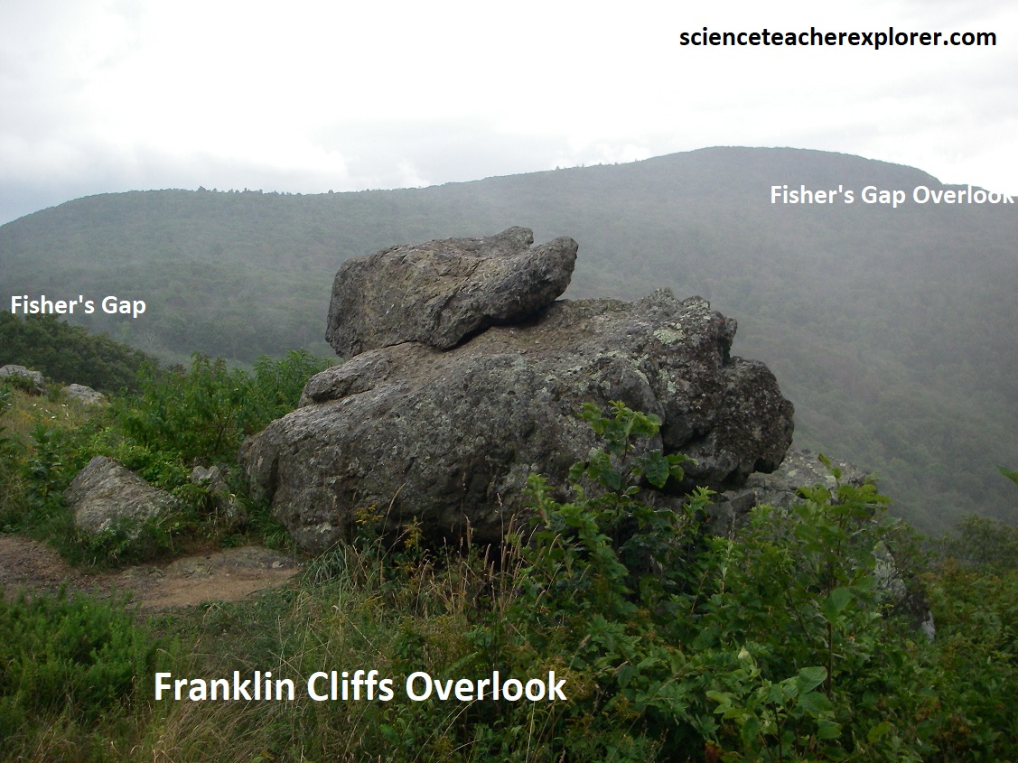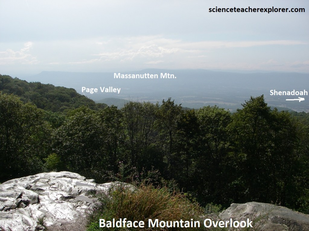 We continued driving south, skipping Bootens Gap, (where we crossed the Elkton Fault), The Point Overlook, and the Oaks Overlook, {It was raining pretty hard}. We also drove past Bearfence Mountain and Lewis Mountain. In about 12km the rain ceased and we were able to stop at the Baldface Mountain Overlook, (pictured above). This gave us an excellent view at the south end of Page Valley and the southern part of Massanutten Mountain. Elkton is seen on the left, (10km due west) and the town of Shenandoah was seen on the right, (14km northwest of us).