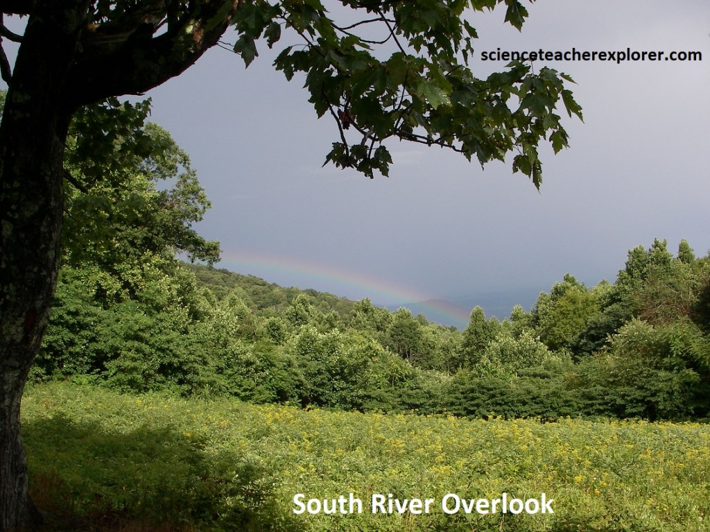 Down the road, we stopped to get a picture of a rainbow from the South River Overlook, (pictured above). Note that the Sun is behind us at 420 from the horizontal, while we look into a rainstorm. We also notice a change in vegetation: dogwood, grapevine, black cherry, persimmon, black locust, Virginia pine, pitch pine, red oak, yellow poplar, ash trees, sugar maple, black birch, hickories, wild hydrangea, bluets, Indian pipes, basswood, hemlock, yellow birch, hornbeam, black gum trees, butternut. & maidenhair.