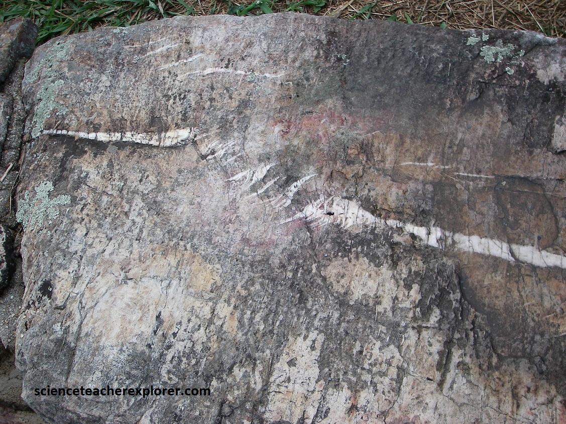 Pictured above, Becky and I drove past a road-cut that showed an attractive outcrop of Cactoctin meta-basalts with fresh surfaces. Their fresh, un-weathered surfaces provided excellent example of greenstone with veins of bright green epidote and white quartz.