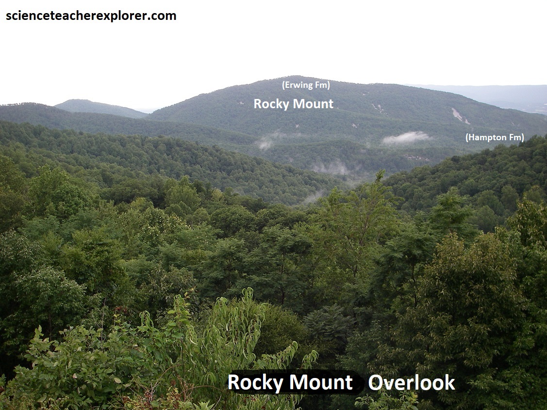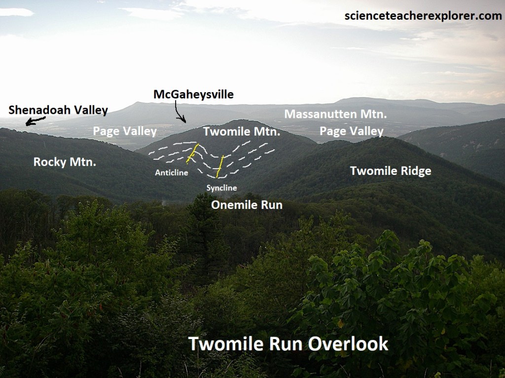 At Twomile Run Overlook, the view northwest across peaks of Erwin and Hampton Formations at the south end of Massanutten Mountain looming up out of the broad Shenandoah Valley. The canyon trending northwest from the overlook toward the south end of Massanutten is Onemile Run. Twomile Mountain at the foot of Onemile Run contains and excellent example of folding but is not visible with the vegetation. Rocky Mount is the prominent peak directly north of the overlook.