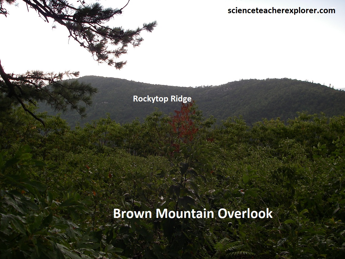 Our next view looks down the valley of Rock Mountain Run below the Rockytop Ridge, (pictured above). The large mountain immediately north-west of the valley is Rocky Mountain & Brown Mountain, which is part of the same ridge and is hidden behind it. All these “rocky” names are inspired by the very hard, resistant quartzite beds in the Chilhowee strata which form the prominent cliffs, scree slopes, block fields, and jagged rock formations which abound in this region.