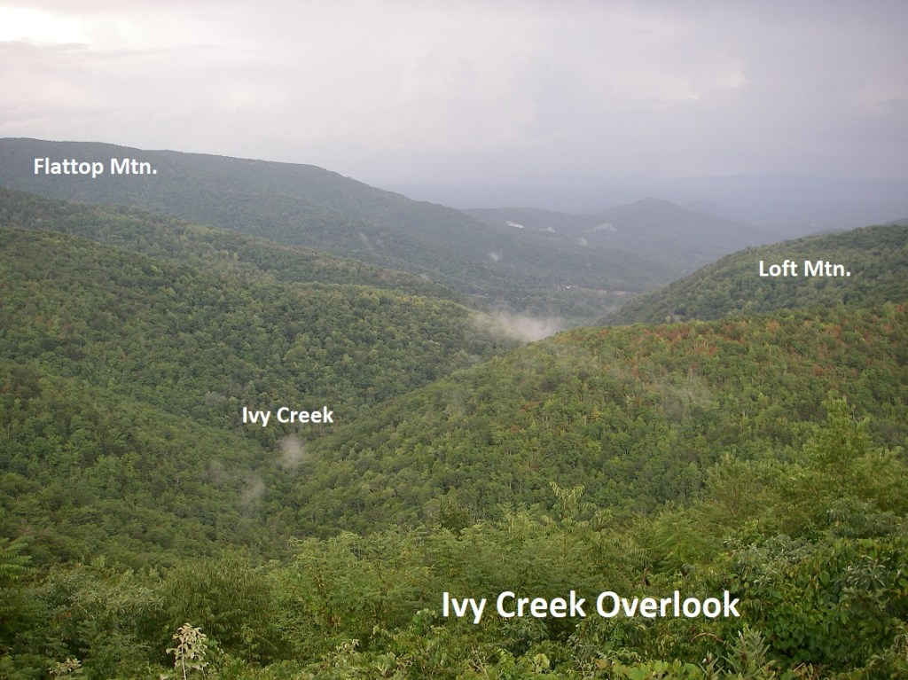 In the next 1.5km, we stopped at the Ivy Creek Overlook to view east down Ivy Creek valley with Flattop Mountain to the left and Loft Mountain to the right.