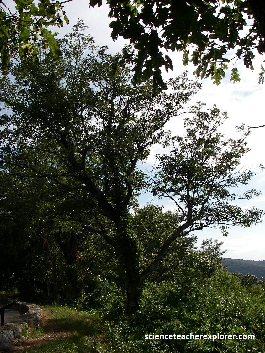 Becky and I drove another 6km south southward, passing Rockytop Overlook & Loft Mountain Junction when we approached the Big Run Overlook with a large wide view framed by trees. We stopped! The main view was northwest along Big Run at the Big Run portal, where the narrow gap through at the lower end of the valley shows Massanutten Mountain in the distance. However, the large trees were “Old Chestnuts”. Pictured above, “Old Chestnuts” are extremely rare in the U.S. and non-existent in Shenandoah N.P.. Since the early 1900s, when a deadly blight first entered this country on imported Asiatic chestnut trees, once-impressive American chestnut trees have died en masse. Magnificent shade trees often growing to 33m, American chestnuts were once common in the Appalachians. Before the blight’s arrival, the chestnut provided food for livestock and wildlife, and the tannin-rich wood and bark were used by locals for lumber, tanning, and charcoal production. Note that in Big Run Valley the “Old Chestnut” is seen occasionally.