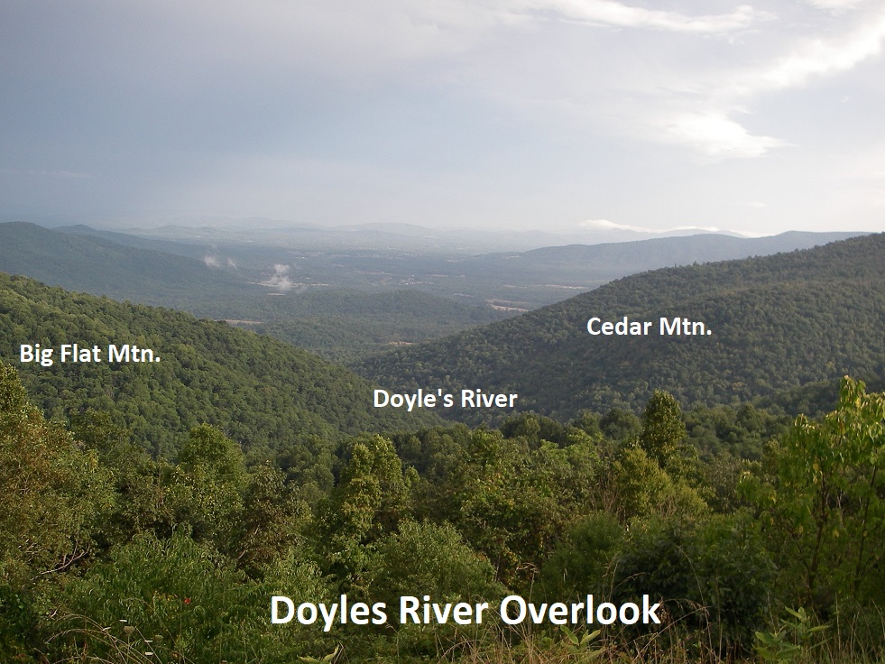 Pictured above, the Doyles River Overlook view southeast down Doyles River valley. Big Flat Mountain is at the far left and Cedar Mountain is to the right. The Weverton Formation of the Cambrian, underlies this overlook and is well exposed nearby. The deep forested canyons and adjacent mountains below are formed from Catoctin greenstones, and the Pedlar Granite comprises the lower terrain beyond.