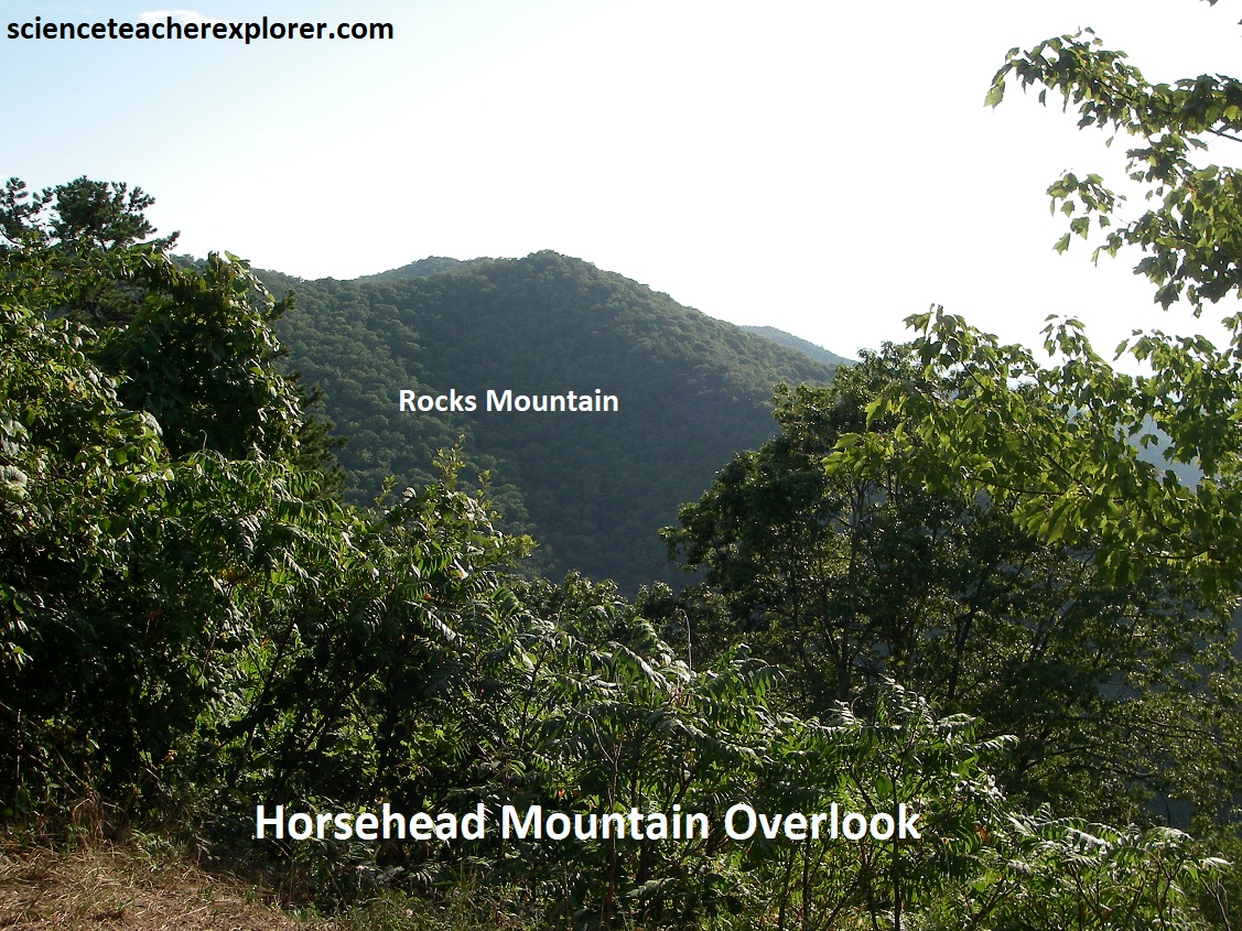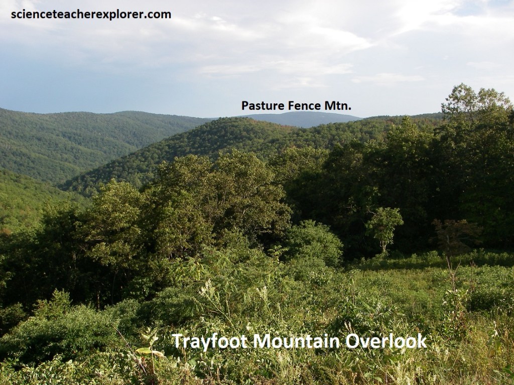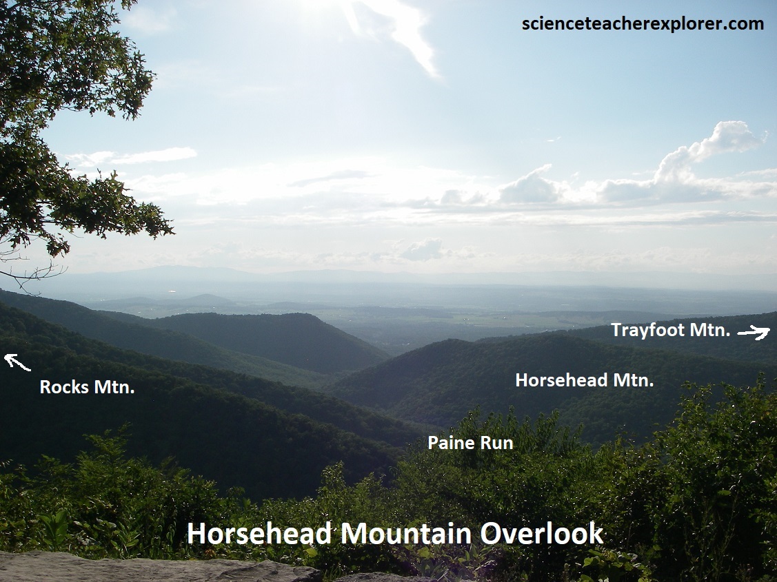 Our next stop was Horsehead Mountain Overlook, (pictured above). This overlook gave us a fantastic view west at the canyon of Paine Run with Trayfoot Mountain to the right and Rocks Mountain to the left. Rocks Montain is capped by the Erwin Formation in the center of a synclinal fold. Trayfoot Mountain, on the other hand, is underlain by the Hampton Formation.