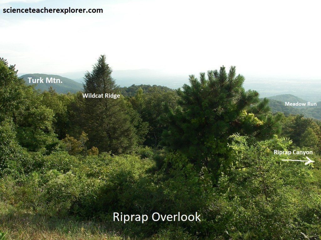The next stop was Riprap Overlook. This large overlook, with its stand of pine and dogwood, face west toward Riprap Hollow Canyon. These valley are drained by Meadow Run, which sinks into the gravelly alluvial deposits at the foot of Blue Ridge before reaching the South River & then the South Fork of the Shenandoah. Pictured above, the high peak on the left is Turk Mountain which is also capped by Erwin quartzites nestled in the nose of another south-plunging syncline, (like Rocks Mtn.).