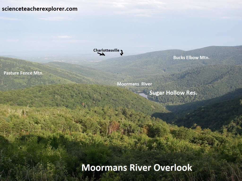 Pictured above, Moormans River Overlook views to the southeast towards Sugar Hollow Reservoir, (Charlottesville Reservoir), located on the Moormans River. The reservoir itself rests on granitic Pedlar rocks. Metamorphosed Catoctin volcanics make-out the surrounding mountains, including the Pasture Fence Mountain on the left and Bucks Elbow Mountain on the right. Charlottesville, receives water from the reservoir 27km to the east. Interestingly, the Moormans River splits and branches in 2 different directions after it leaves the reservoir. This suggests that maybe there is an underlying fault controlling the water flow.
