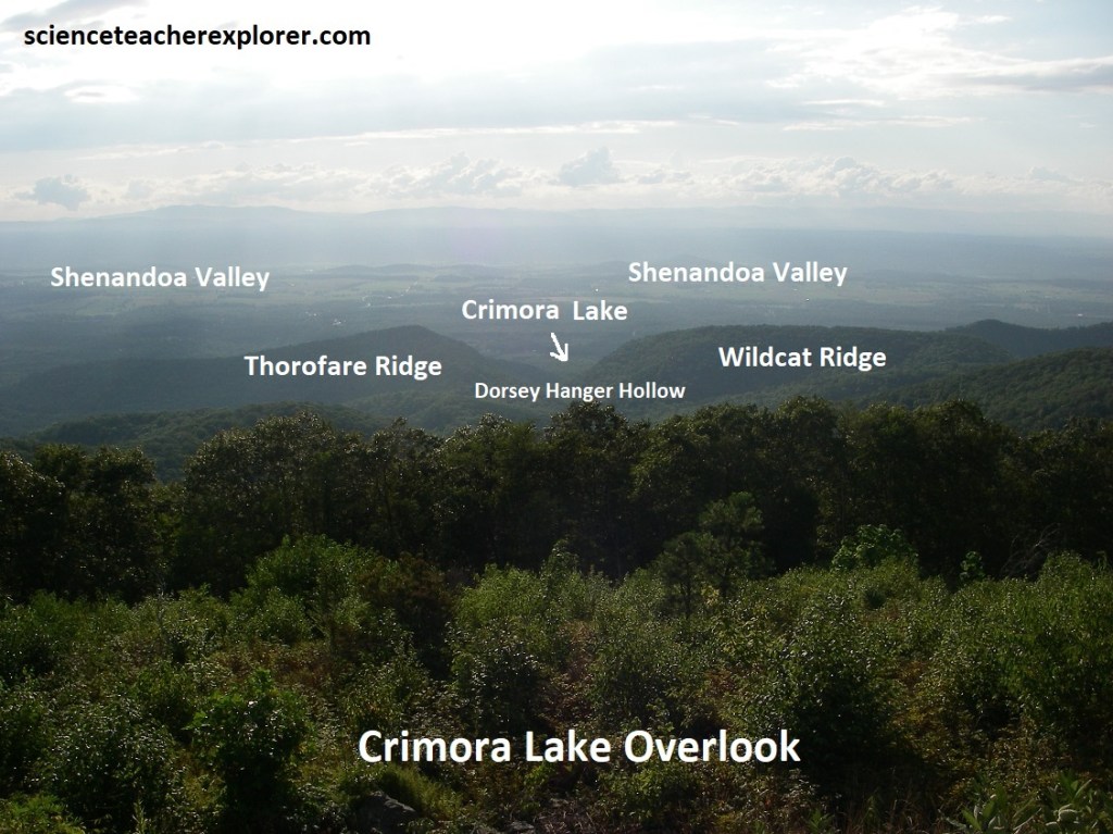 From Crimora Lake Overlook, we could look down the Dorsey Hanger Hollow, with Thorofare Ridge on the left and Wildcat Ridge at right. Crimora Lake is a small reservoir in Dorsey Hanger Hollow. Behind Throrofare Ridge, on the alluvial apron of the Blue Ridge, are parts of an abandoned manganese mining operation that began in 1867 and operated intermittently until 1946. These were open-pit mines that used water from Crimora Lake to separate lumps of manganese ore from the clay and quartz fragments, all of which had been concentrated near the surface by long-term weathering processes. Over half the manganese mined in the United States came from this mine.