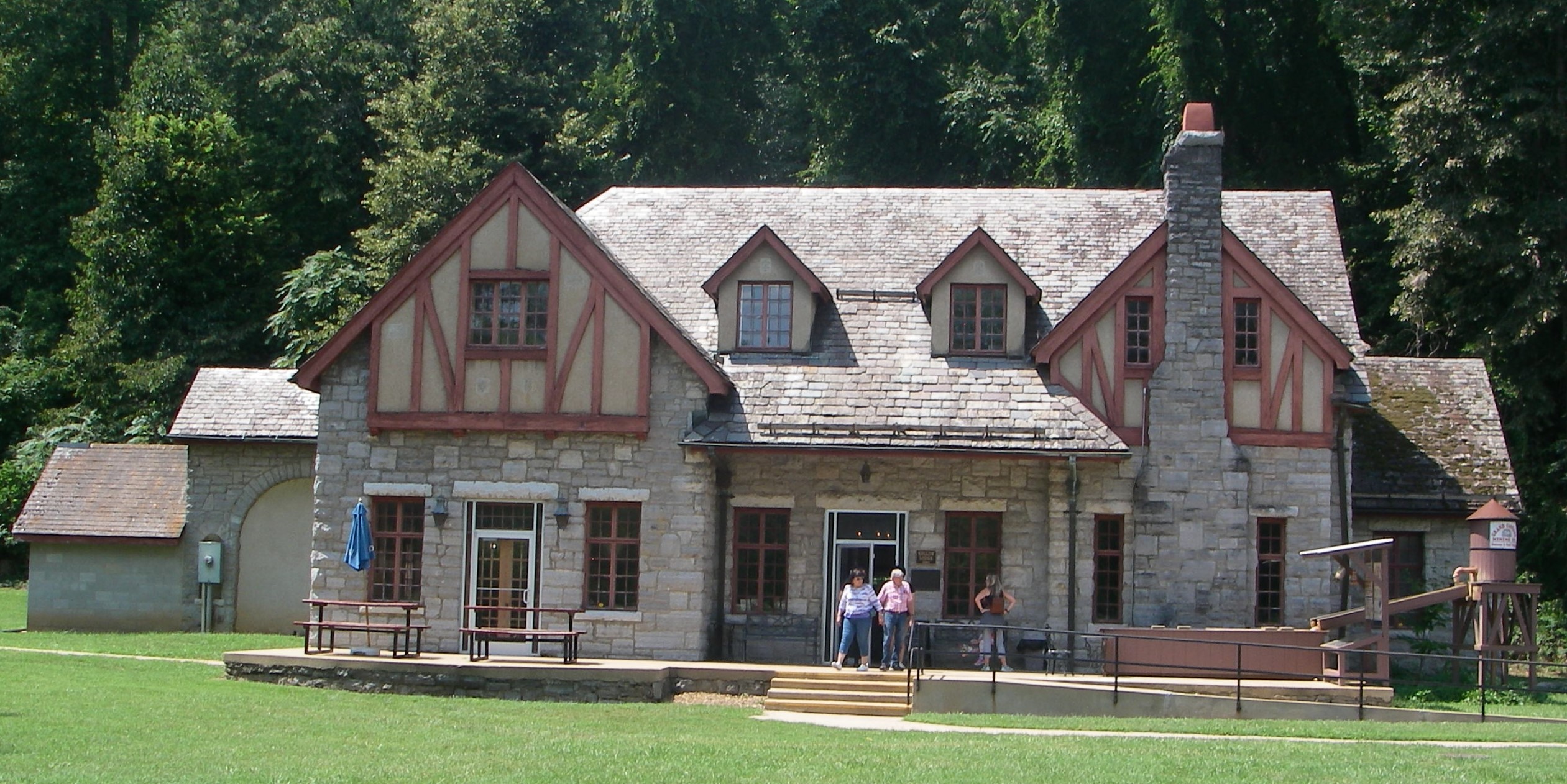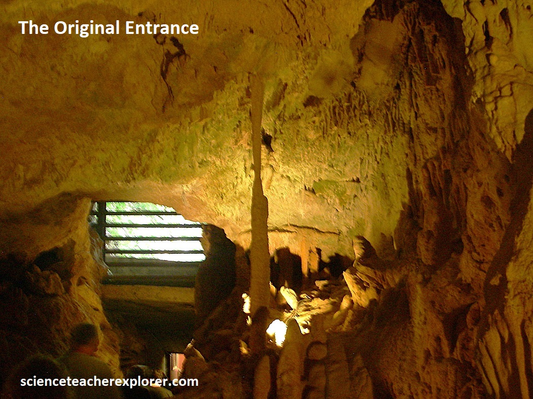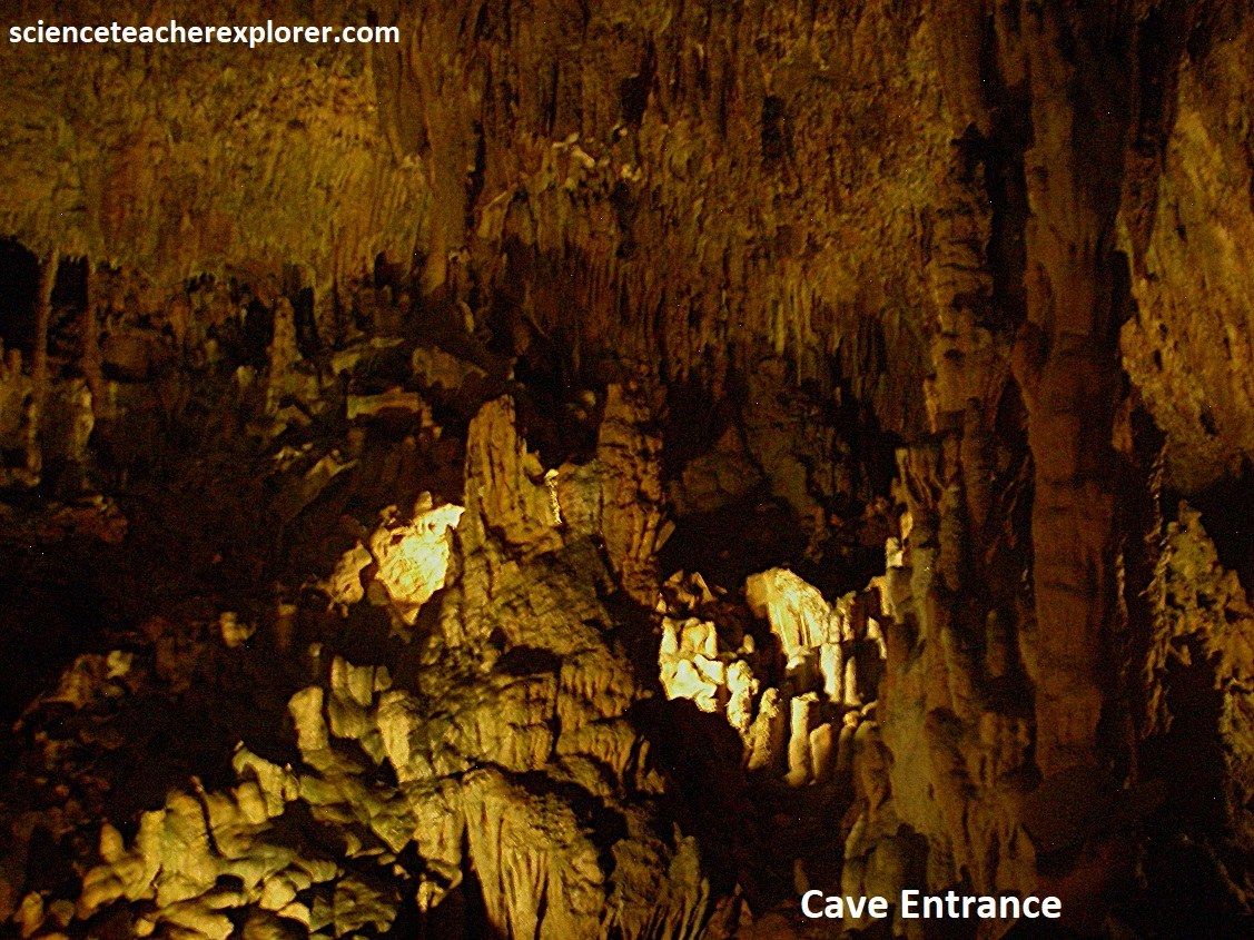 The Shenandoah Valley exists because it is underlain by a thick sequence of nonresistant, folded sedimentary rocks consisting mainly of limestone, dolomites and shales of the Cambrian time period. The more resistant limestones and dolomites form ridges than my rise 100m or more above the adjacent land. These steep ridges are not suitable for farming and, consequently, are used as woodlands or pasture. (The pictures below are the entrance to the Grand Caverns or Weyers Cave).