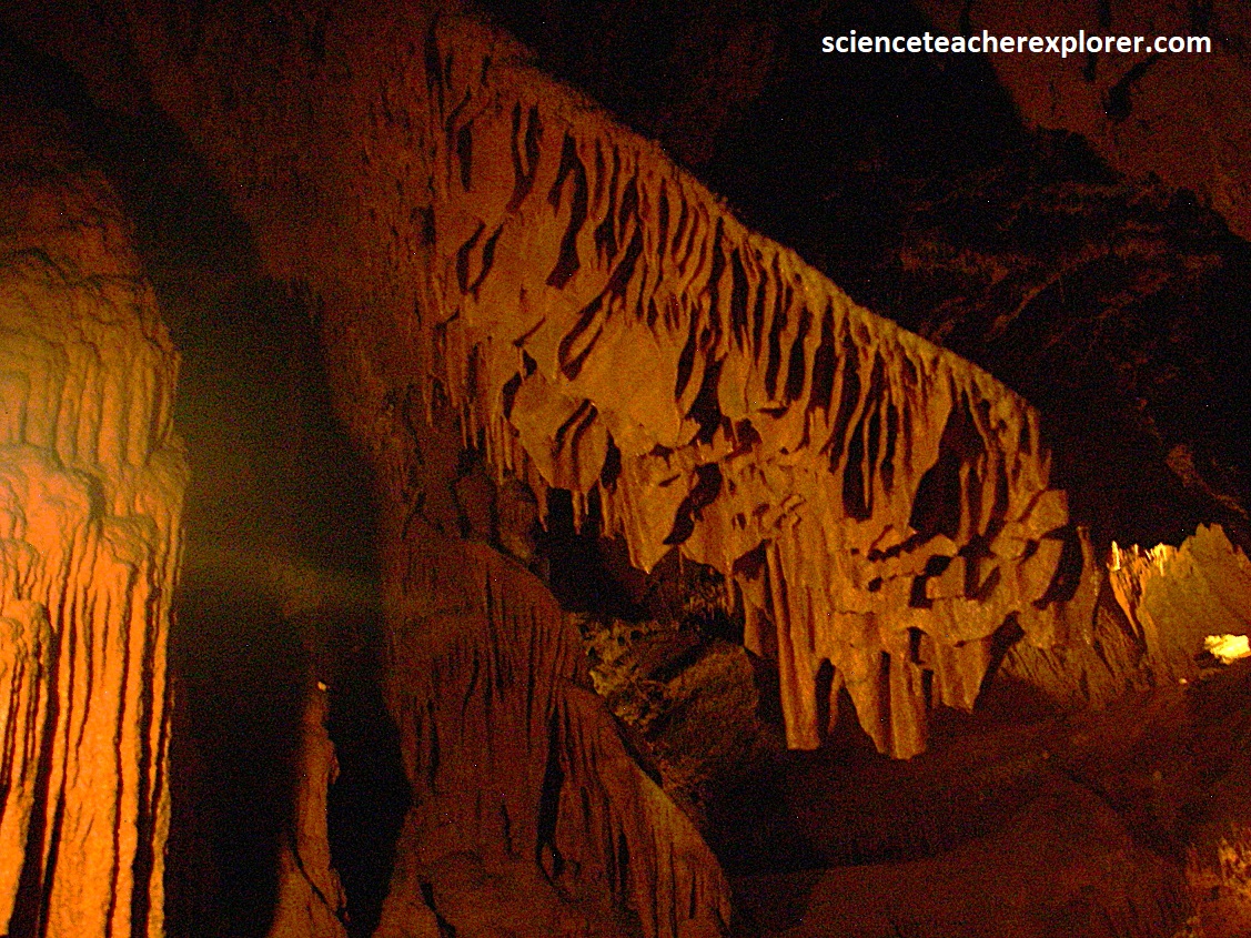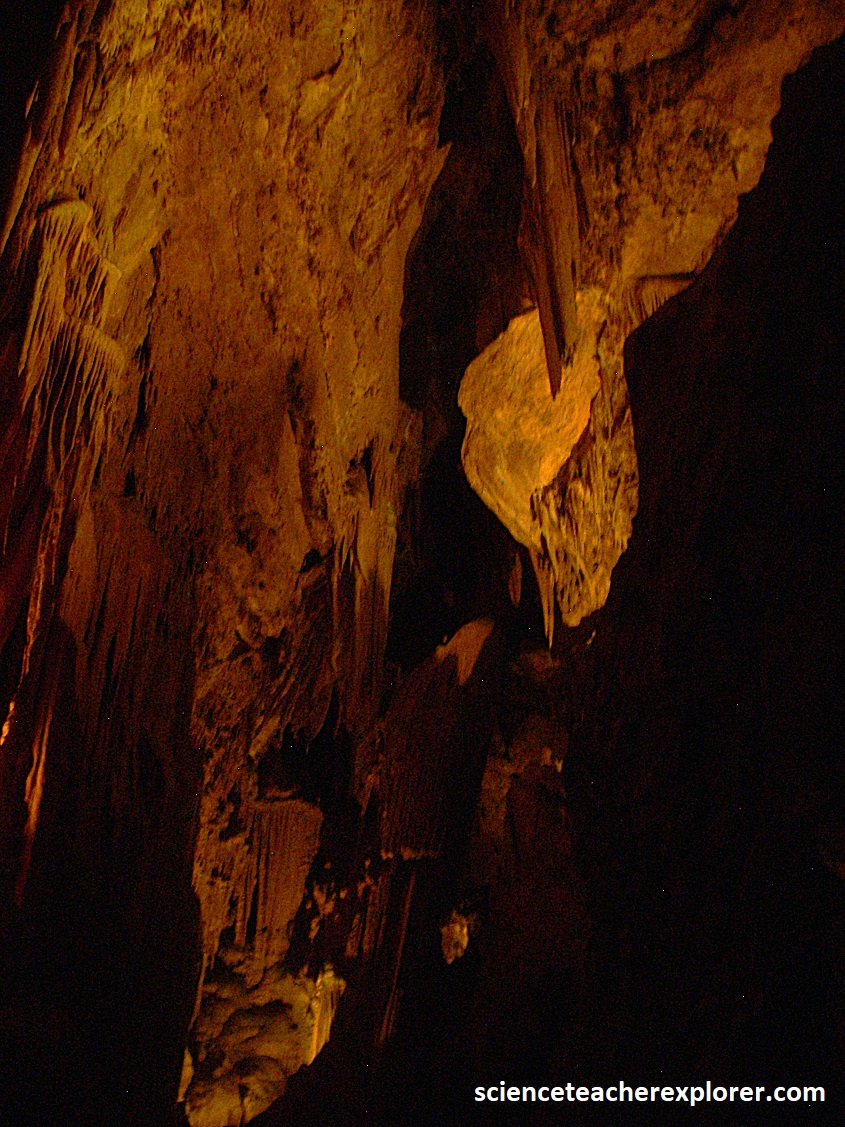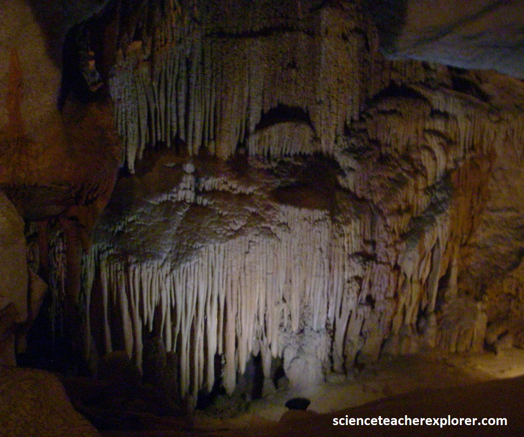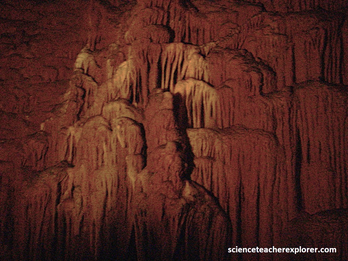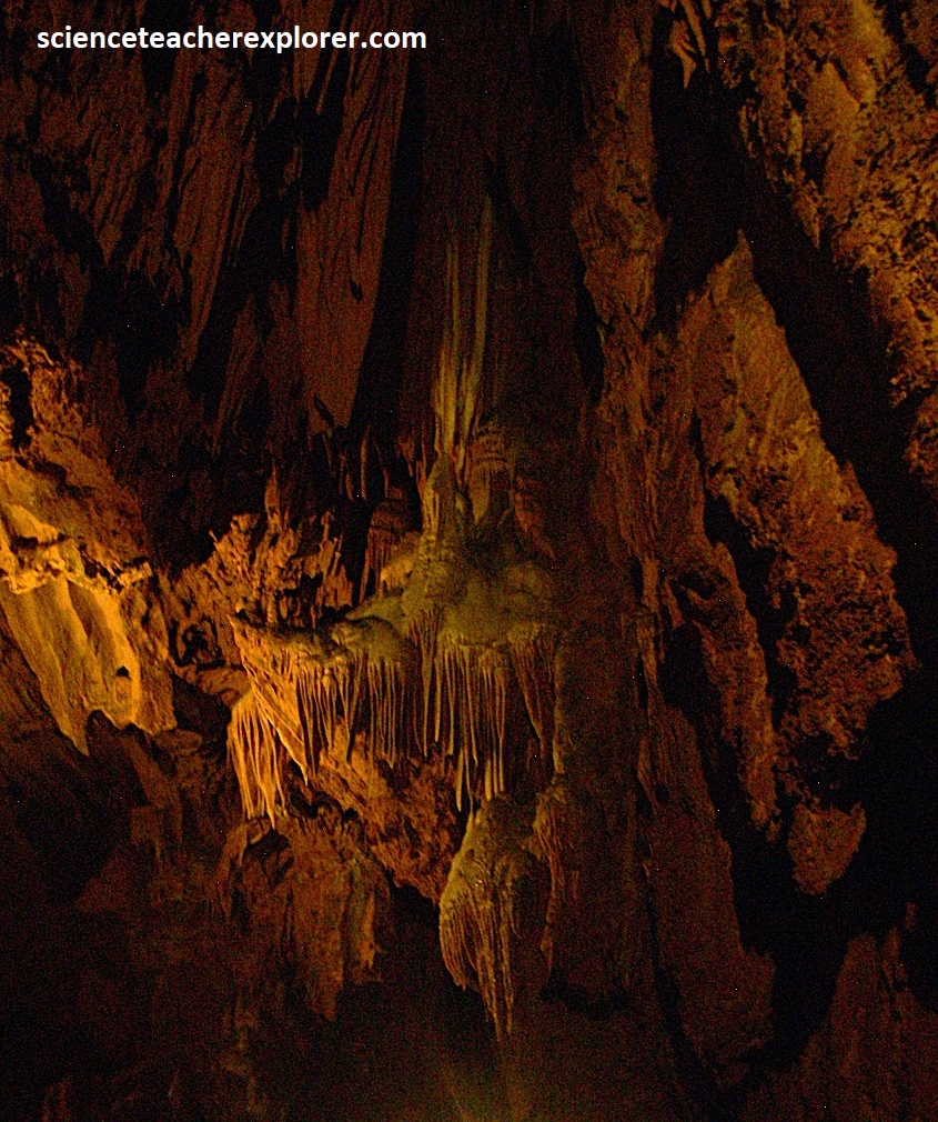 Pictured above and below, another important mineral in these caverns is calcite, (the white-colored deposits), which are the main component of speleothems.