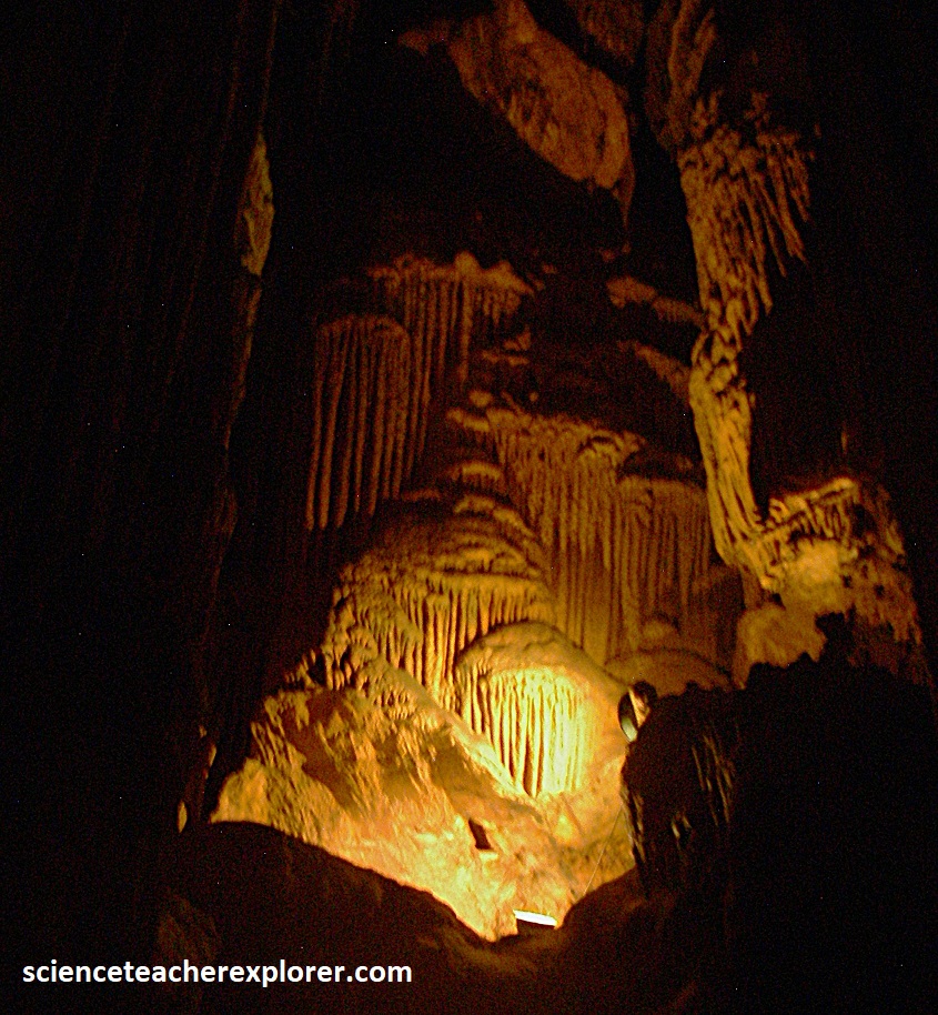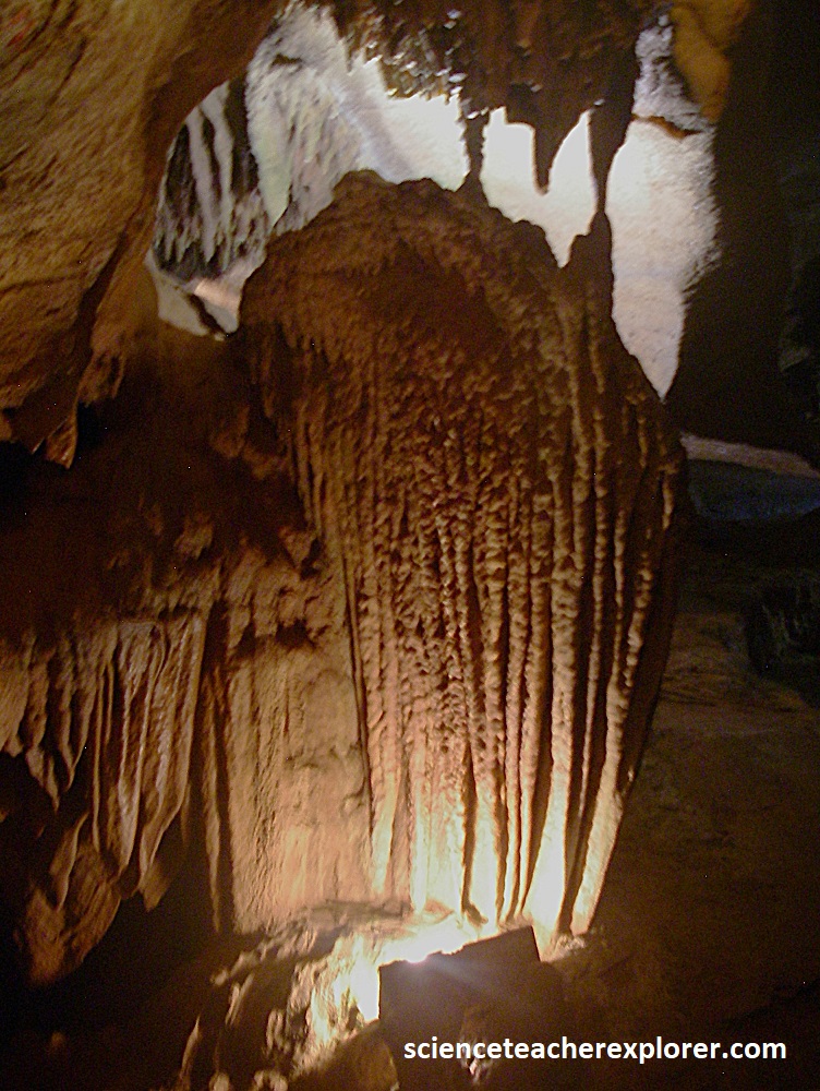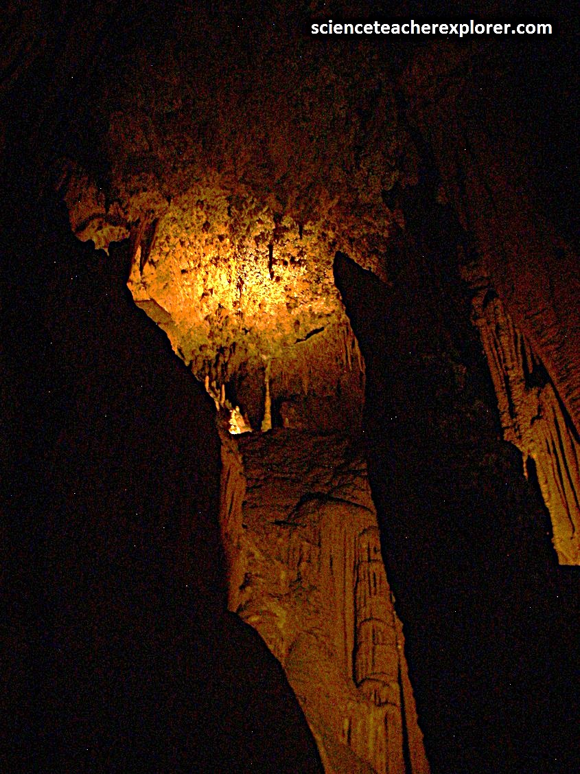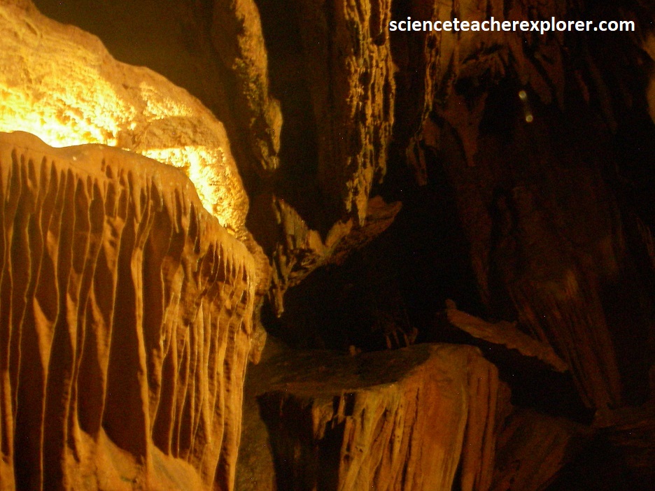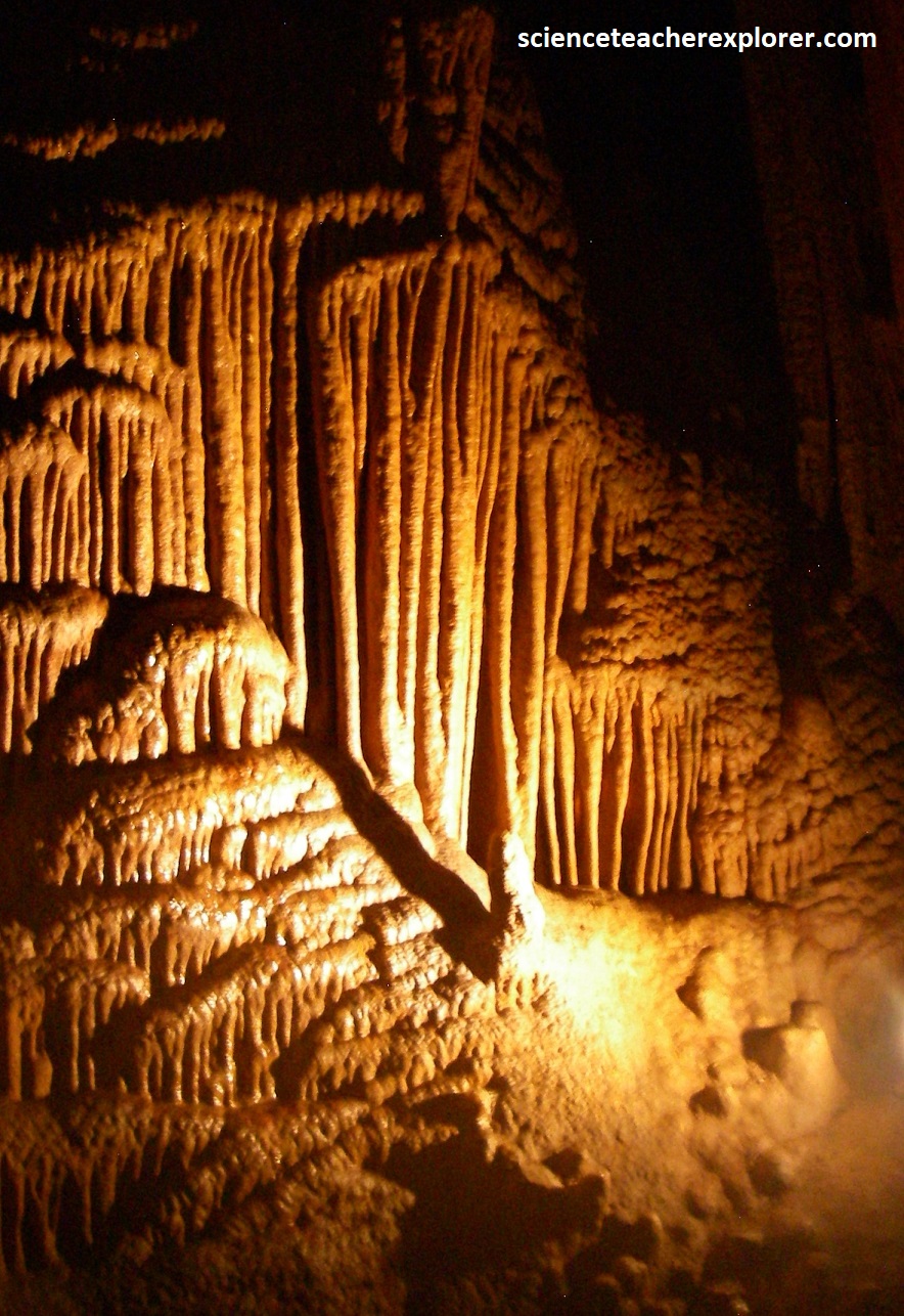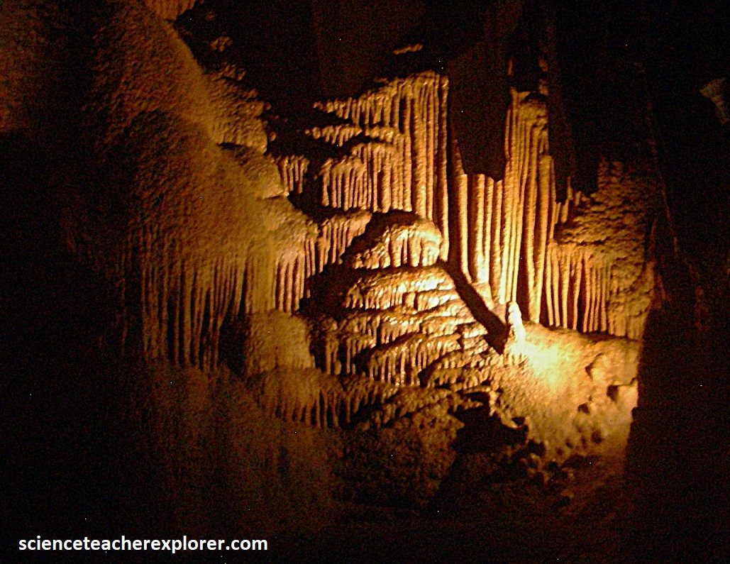 Pictured above and below, another important mineral in these caverns is calcite, (the white-colored deposits), which are the main component of speleothems.
