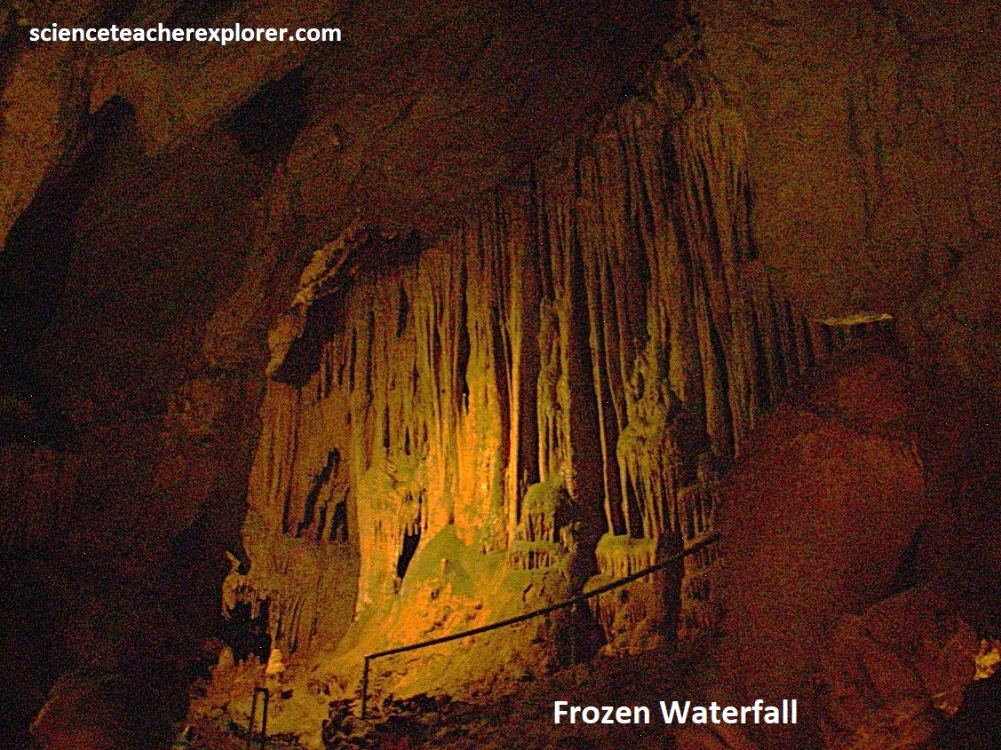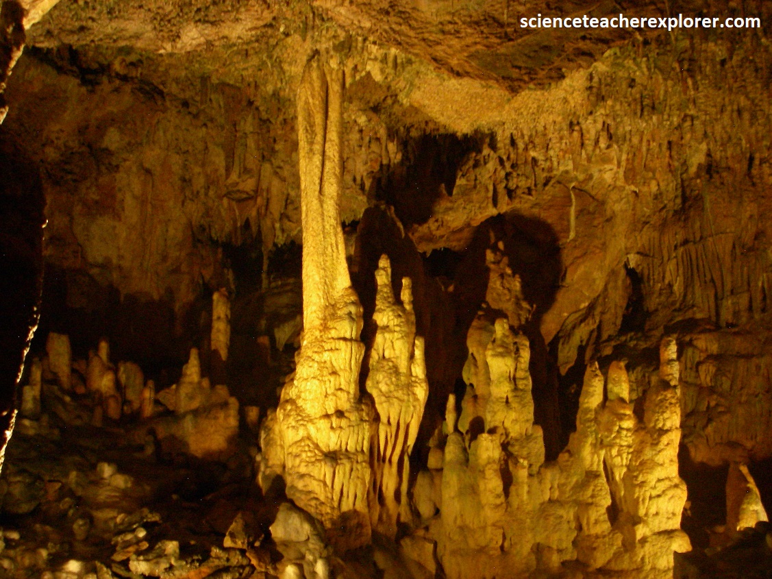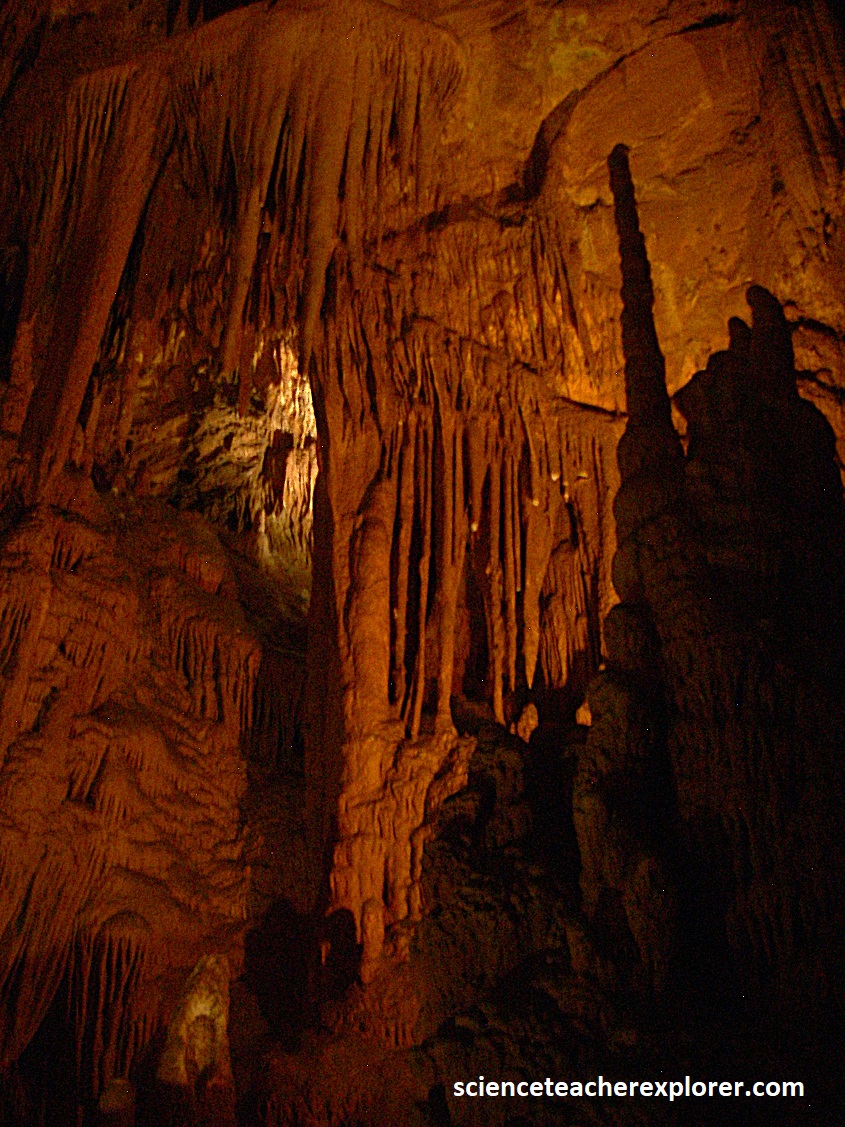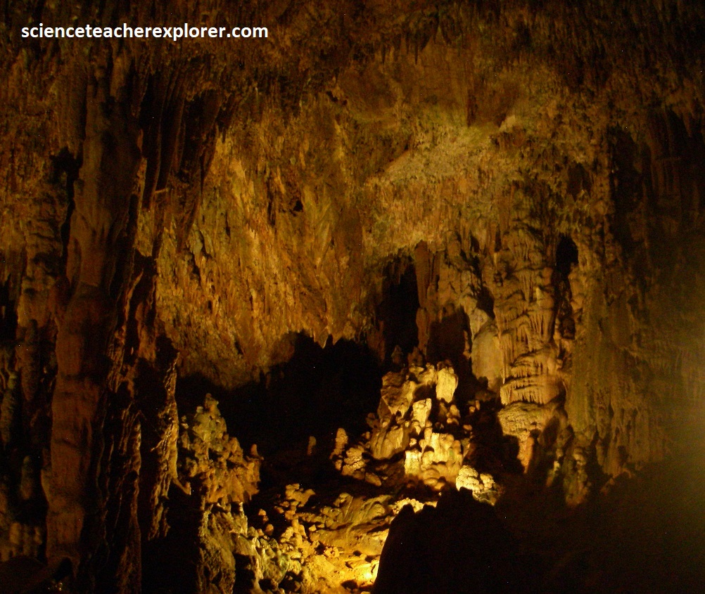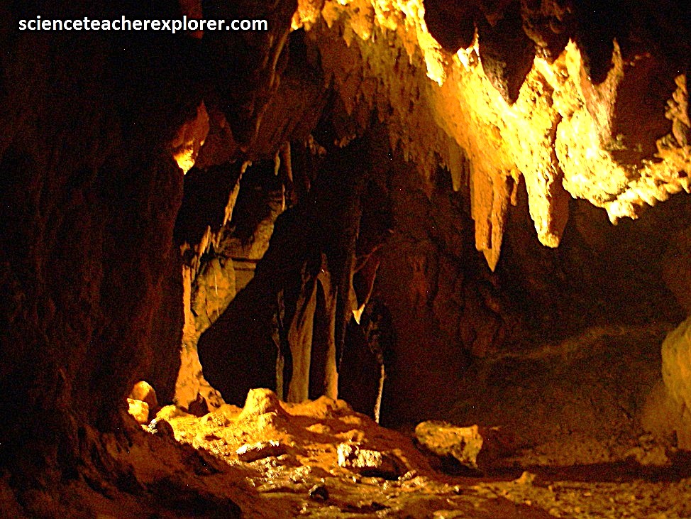 Pictured above and below, another important mineral in these caverns is calcite, (the white-colored deposits), which are the main component of speleothems.